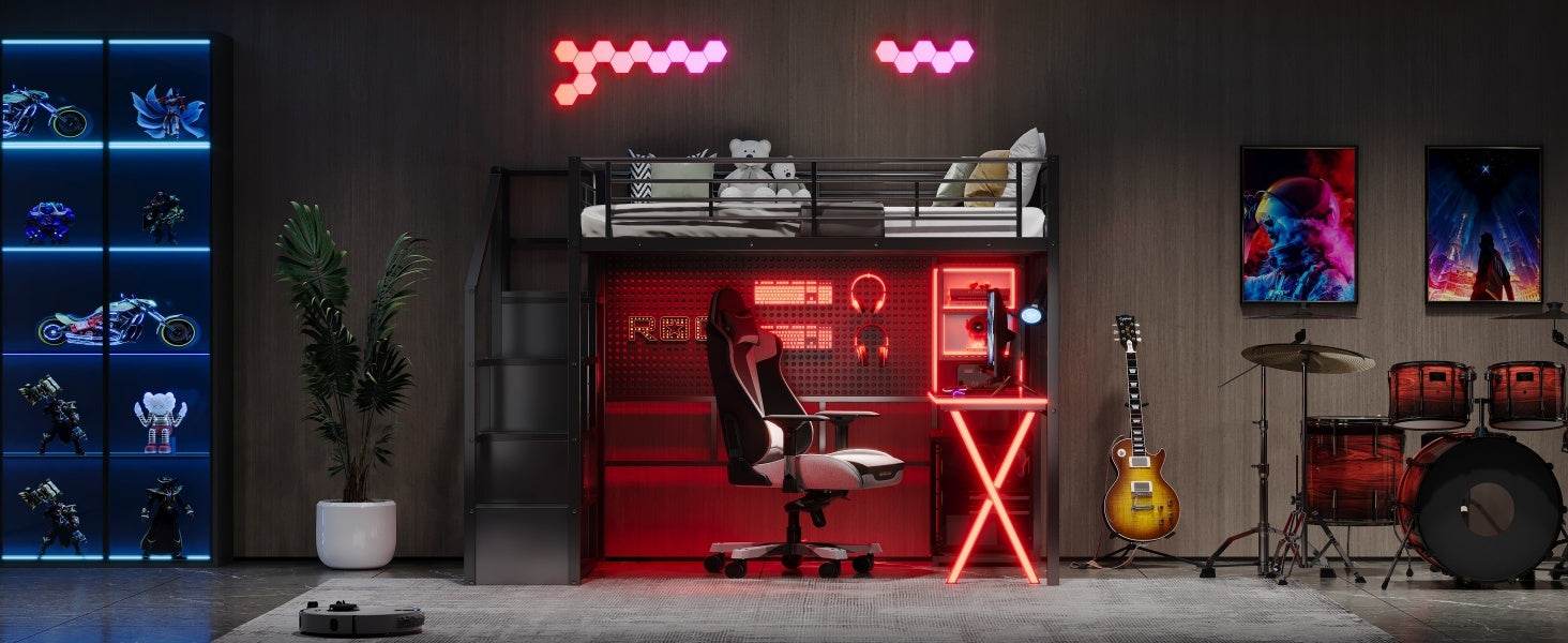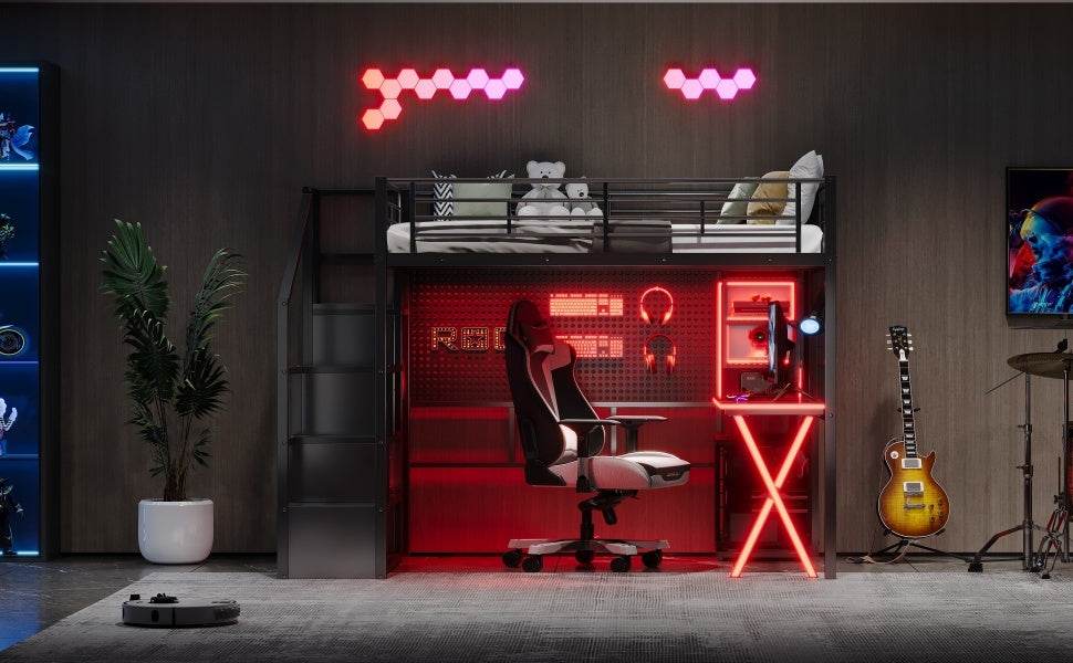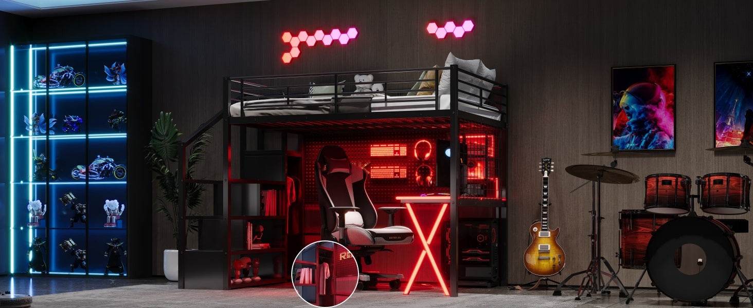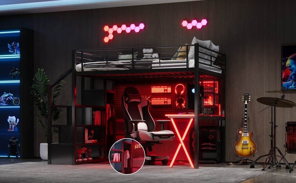 Upgrade your room with this full size metal loft bed featuring a built-in workstation, wardrobe, and storage staircase—all designed to save space without sacrificing style or utility. Crafted from sturdy steel and MDF, this black loft bed supports up to 250 lbs and requires no box spring, making it the perfect solution for small rooms or shared spaces. The integrated desk area includes LED lighting, two storage shelves, a computer host shelf, and grid boards to create a bright, organized workspace ideal for studying or gaming. Safety is prioritized with full-length guardrails and a secure, wobble-free staircase that doubles as additional storage. With easy assembly and a sleek design, this loft bed transforms your bedroom into a multifunctional living and working area. Elevate your room’s style and efficiency today.