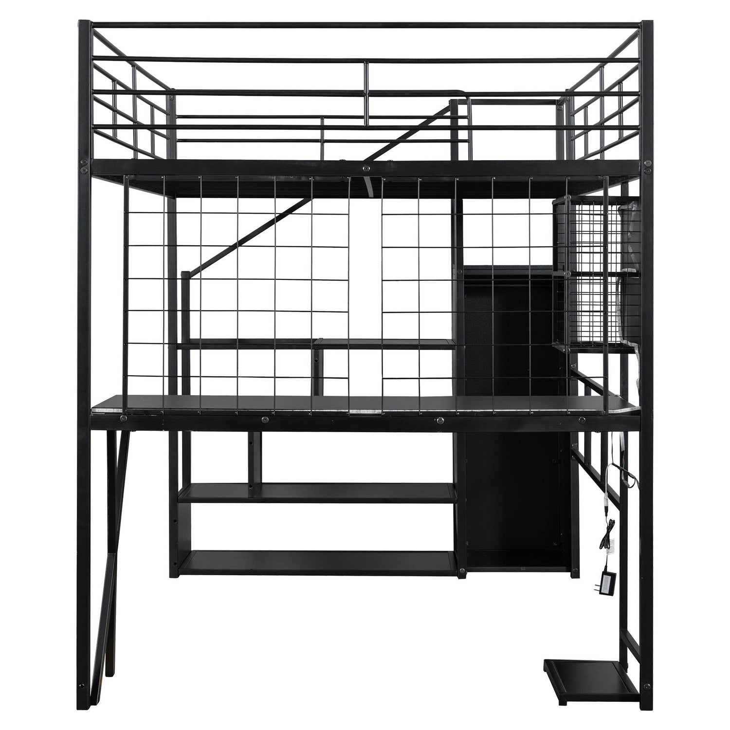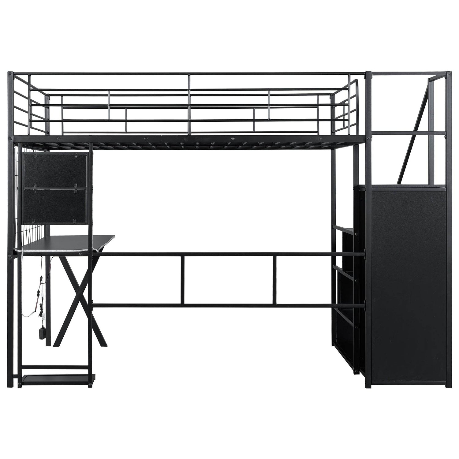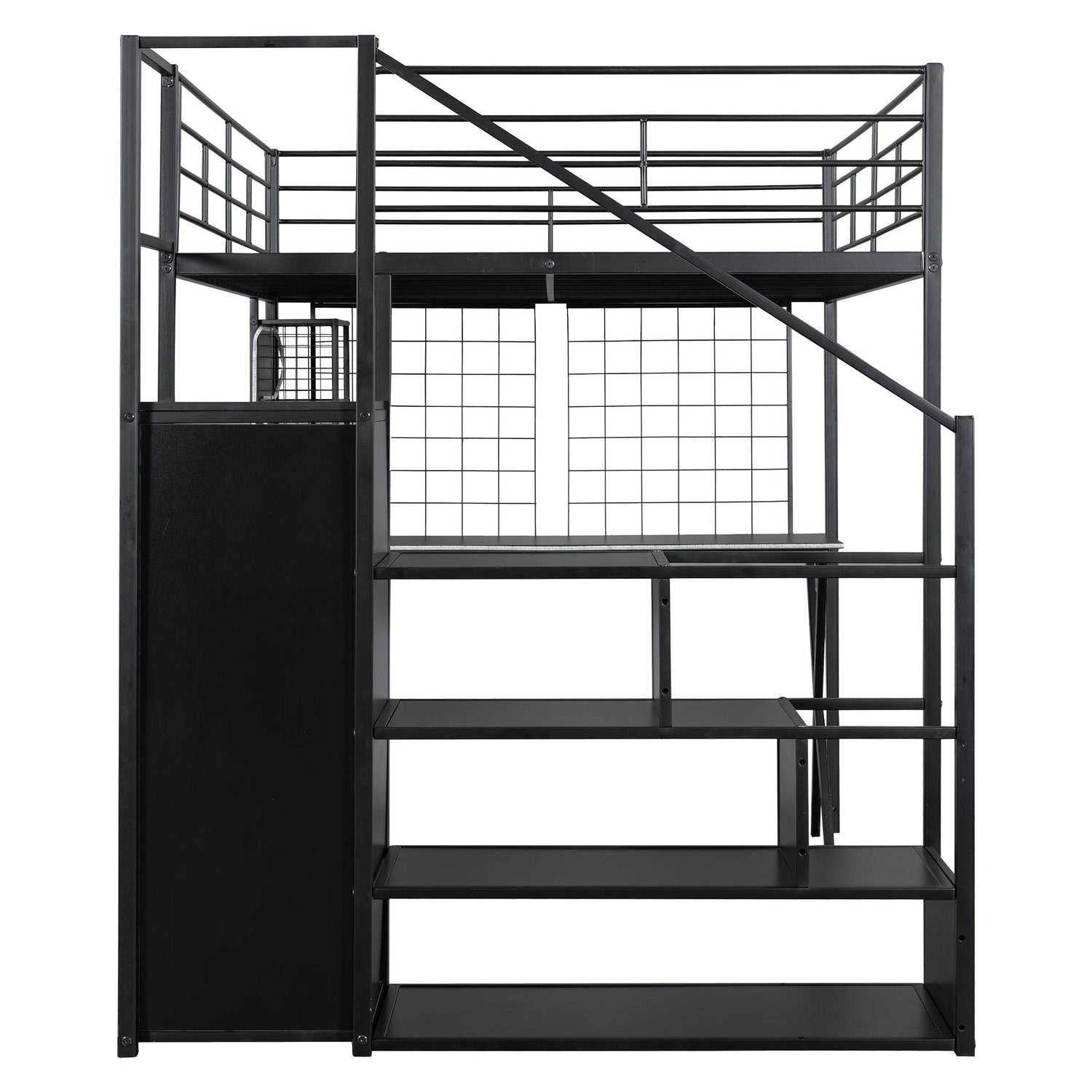 Upgrade your room with this full size metal loft bed featuring a built-in workstation, wardrobe, and storage staircase—all designed to save space without sacrificing style or utility. Crafted from sturdy steel and MDF, this black loft bed supports up to 250 lbs and requires no box spring, making it the perfect solution for small rooms or shared spaces. The integrated desk area includes LED lighting, two storage shelves, a computer host shelf, and grid boards to create a bright, organized workspace ideal for studying or gaming. Safety is prioritized with full-length guardrails and a secure, wobble-free staircase that doubles as additional storage. With easy assembly and a sleek design, this loft bed transforms your bedroom into a multifunctional living and working area. Elevate your room’s style and efficiency today.