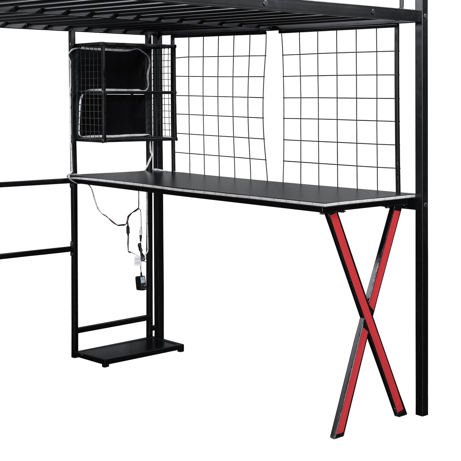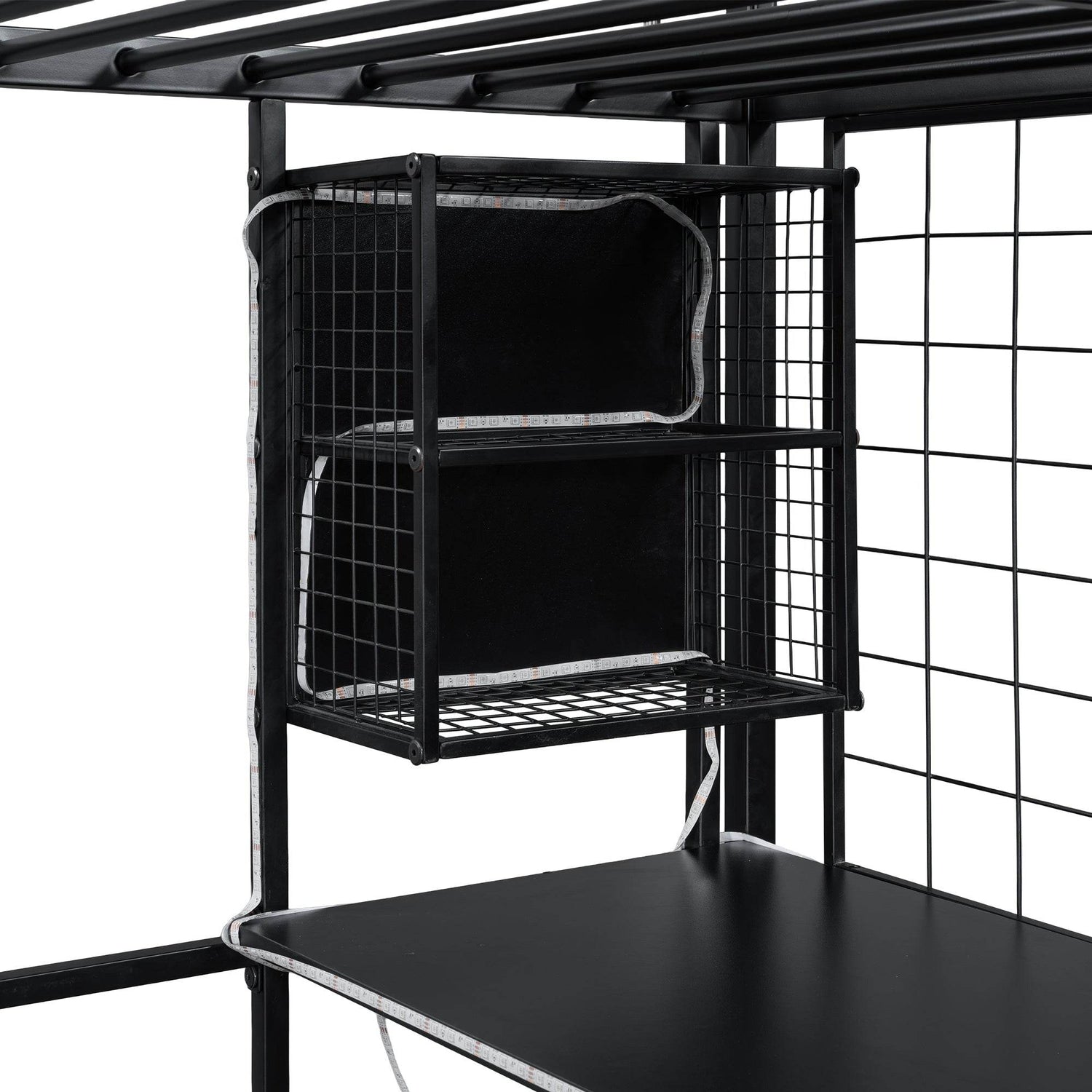 • Built-In LED Workstation: Includes desk with LED strips, 2 shelves, computer host shelf, and grid boards.