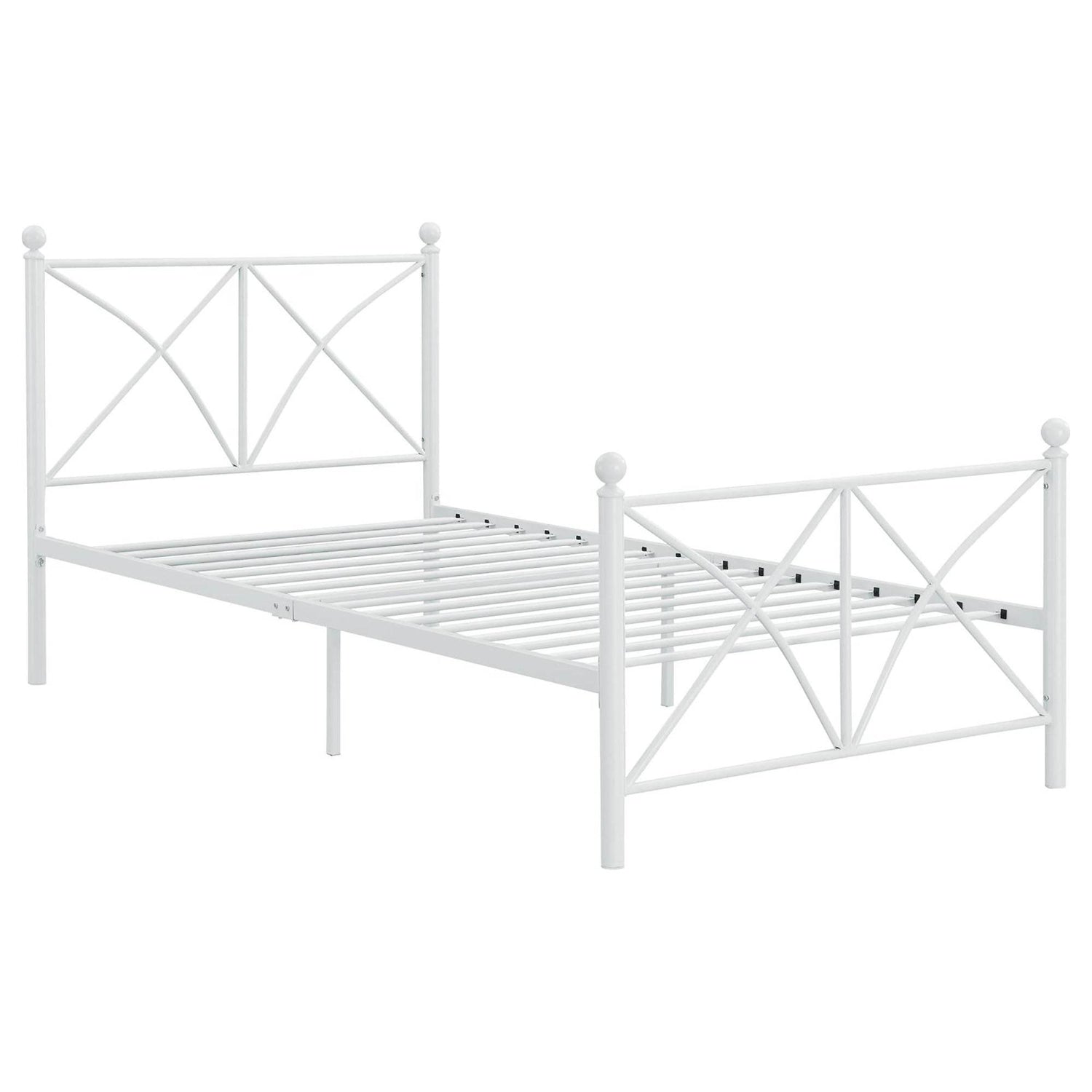 This contemporary white full metal platform bed features a durable open-frame design with a stylish X-pattern headboard and footboard, offering sturdy support without a box spring. Ideal for modern bedrooms, it provides easy assembly and underbed storage.