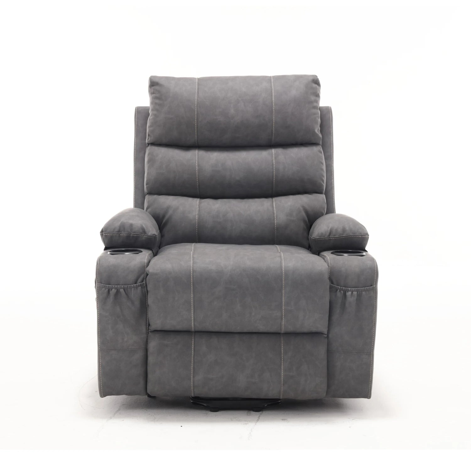 Electric power lift recliner chair in grey PU features a robust motorized lift for easy standing, 21-inch seat width for full hip and leg support, built-in side pocket for essentials, massage and heat functions, ideal for elderly comfort and relaxation.