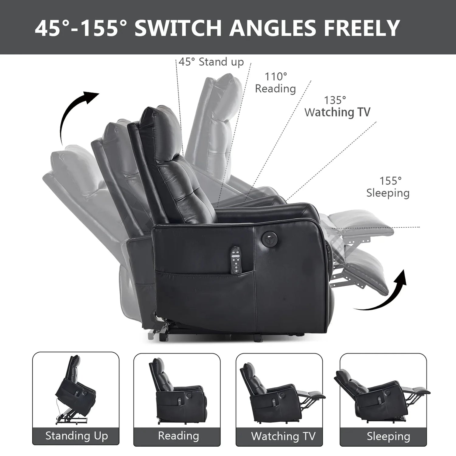 This black faux leather lift recliner chair features power lift assistance and a single-motor recline up to 155°, delivering massage with lumbar heat via eight vibrating nodes for full-body relaxation. Equipped with USB charging, medium-firm cushioning, and heavy-duty durability for primary living spaces.