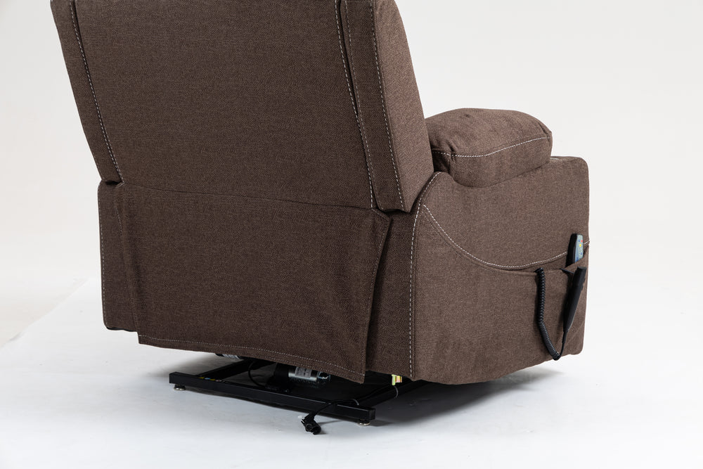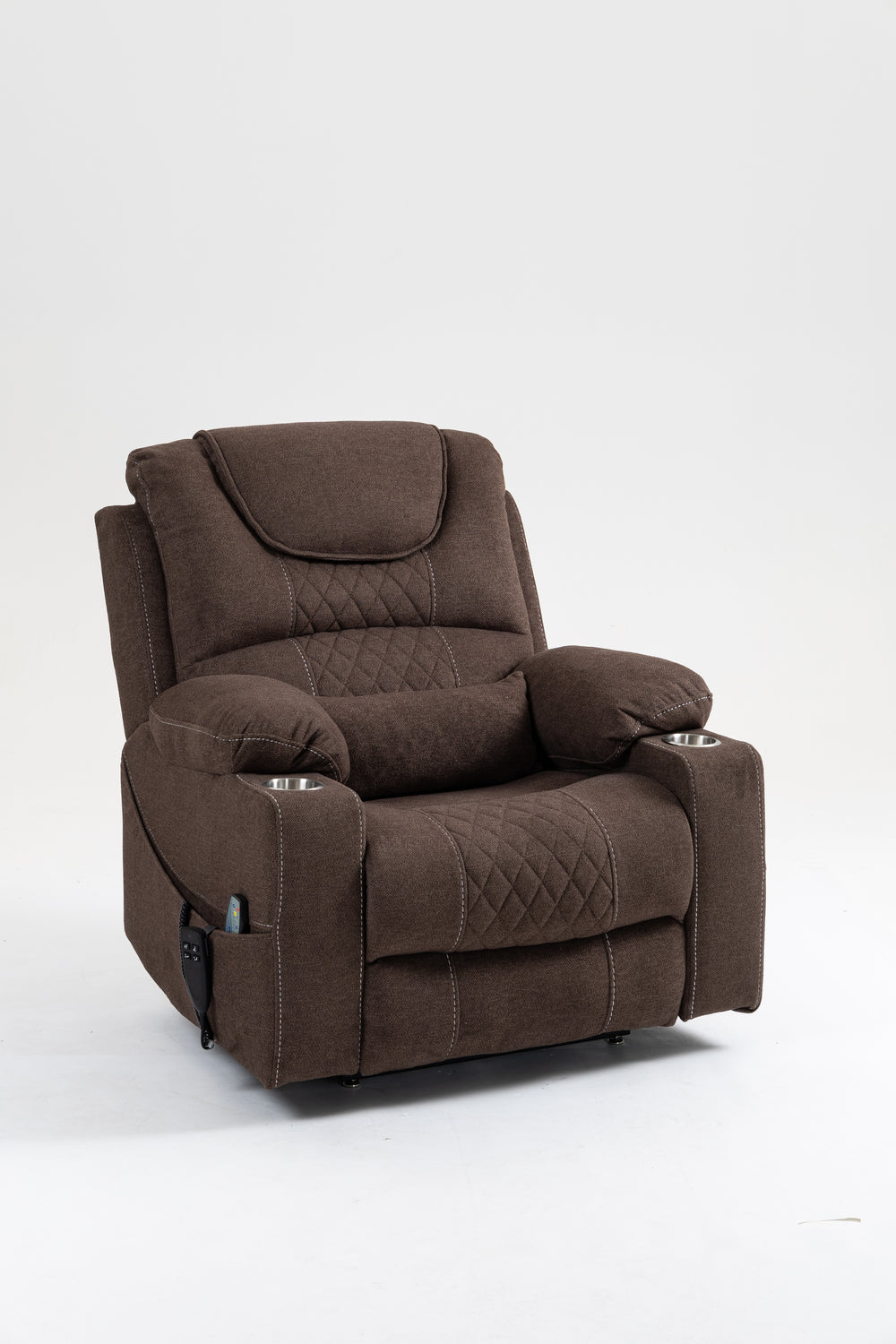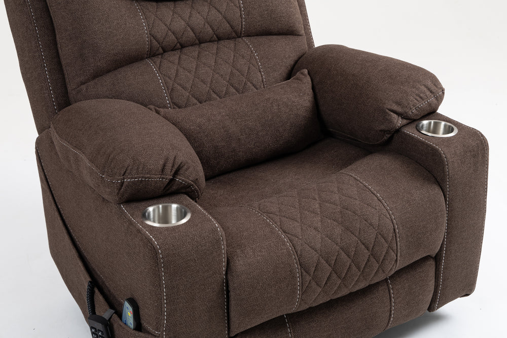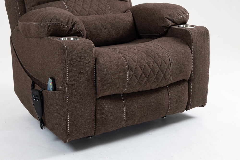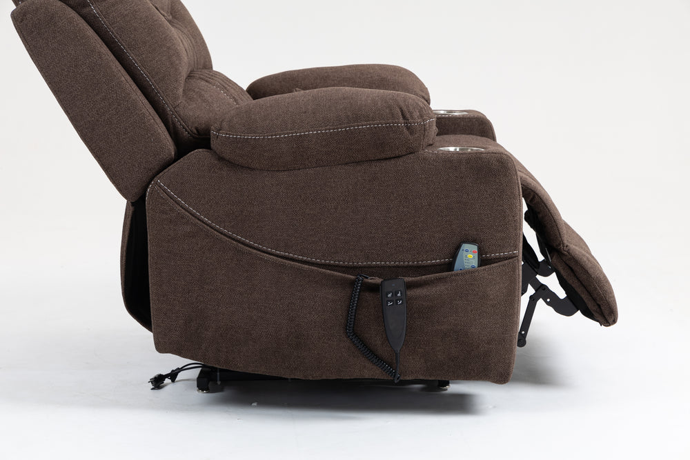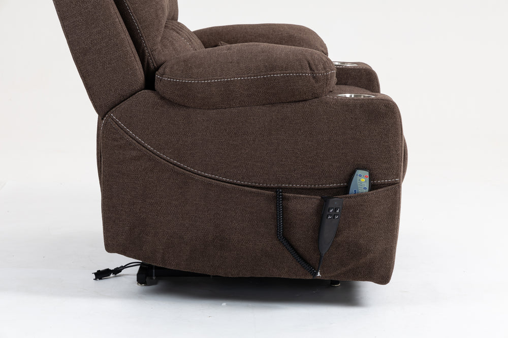 Designed for maximum relaxation and support, this oversized lift recliner chair features premium brown velvet upholstery that feels soft to the touch while remaining durable. Perfectly suited for big and tall individuals, its extra-large 25-inch wide seat and 74.2-inch fully reclined length provide ample space to unwind comfortably. Equipped with a dual OKIN silent lift motor system, you can effortlessly adjust the backrest and footrest independently, reclining up to a flat 180 degrees for optimal resting positions. Thoughtfully crafted for ease of use, the chair includes convenient cup holders on both armrests, keeping your favorite beverages within reach. Built to support up to 400 lbs, this heavy-duty recliner balances strength with plush comfort, making it an ideal choice for lounging, reading, or napping in your sitting room. Elevate your relaxation experience today with this versatile power recliner chair.