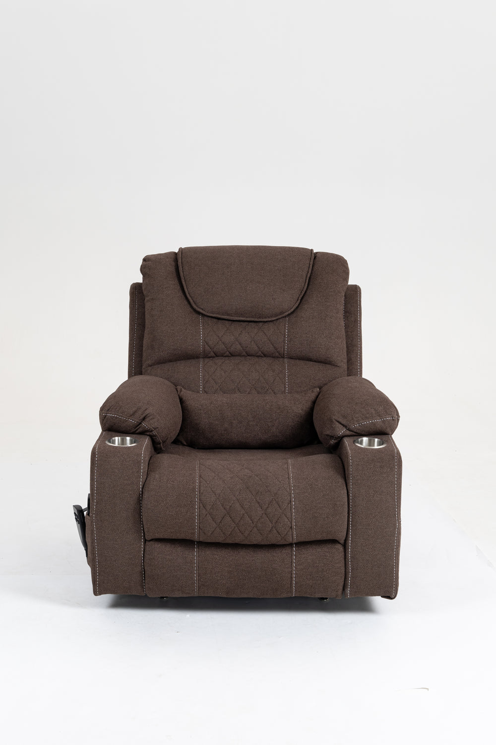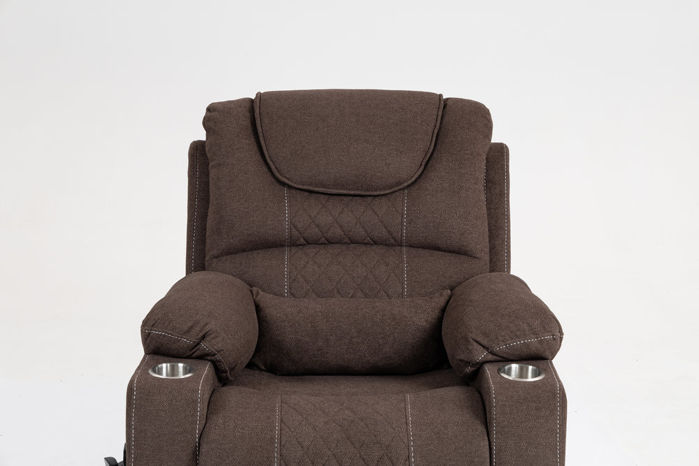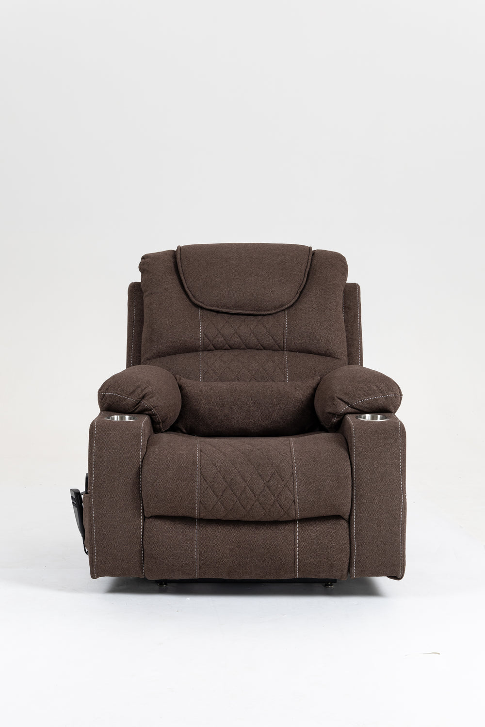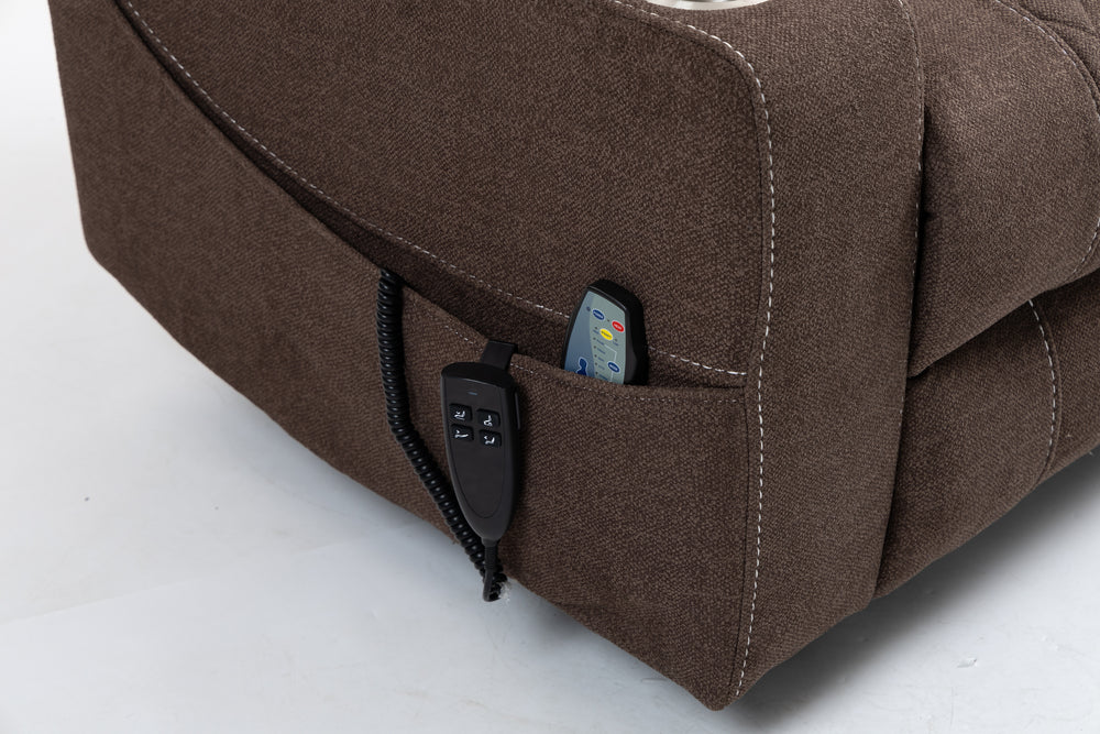 Designed for maximum relaxation and support, this oversized lift recliner chair features premium brown velvet upholstery that feels soft to the touch while remaining durable. Perfectly suited for big and tall individuals, its extra-large 25-inch wide seat and 74.2-inch fully reclined length provide ample space to unwind comfortably. Equipped with a dual OKIN silent lift motor system, you can effortlessly adjust the backrest and footrest independently, reclining up to a flat 180 degrees for optimal resting positions. Thoughtfully crafted for ease of use, the chair includes convenient cup holders on both armrests, keeping your favorite beverages within reach. Built to support up to 400 lbs, this heavy-duty recliner balances strength with plush comfort, making it an ideal choice for lounging, reading, or napping in your sitting room. Elevate your relaxation experience today with this versatile power recliner chair.