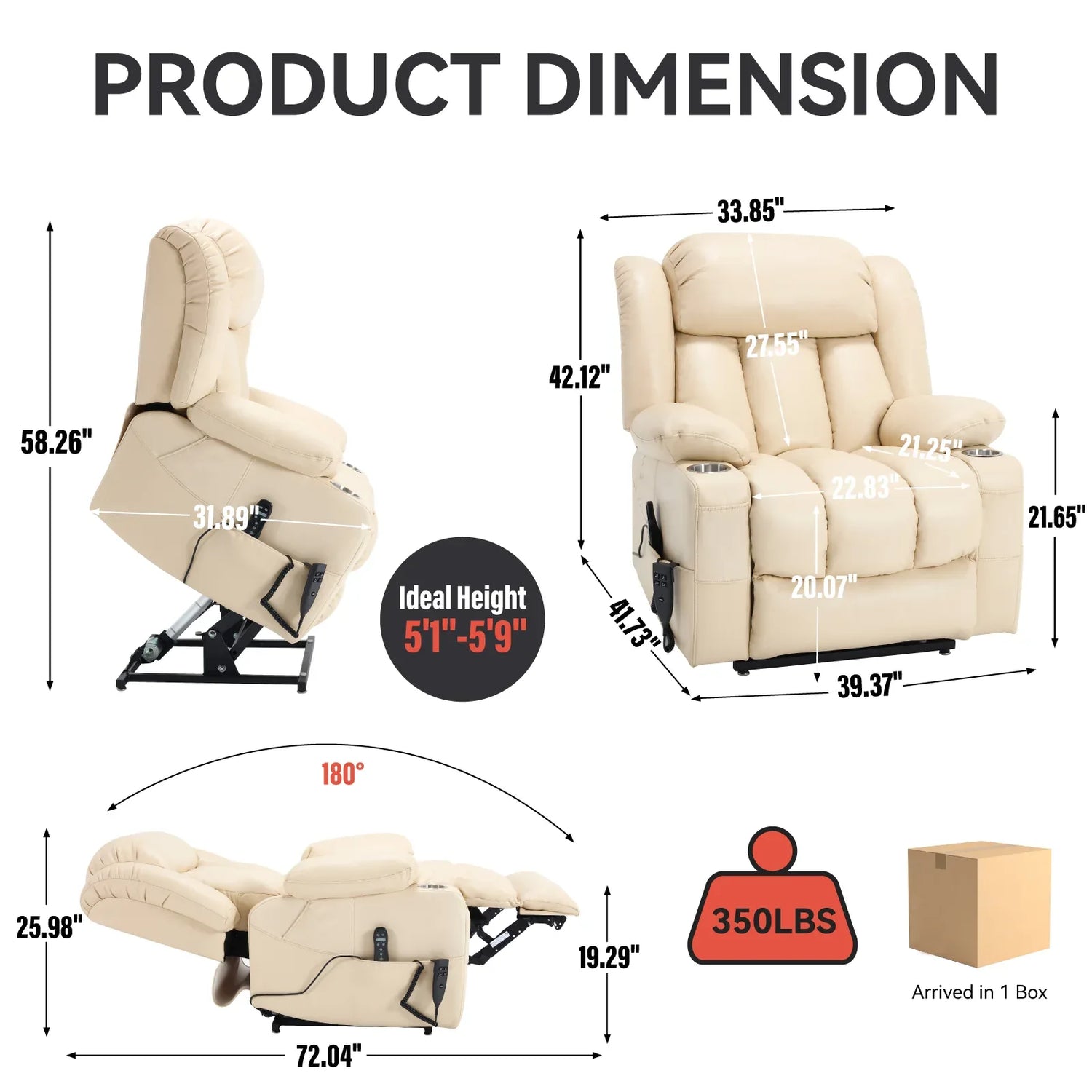 Relax in style and personalized comfort with this beige power lift recliner chair featuring a dual motor system that lets you find your perfect position—from a gentle recline to a full 180-degree lay-flat. Upholstered in premium faux leather, it combines durable metal and natural pine wood for lasting support and an elegant look. This chair provides targeted relief through 8 vibration massage nodes and adjustable lumbar heat, promoting circulation and soothing tired muscles. With user-friendly push-button controls, easily adjust your seating or lift position, ideal for anyone up to 350 lbs. Thoughtful extras like dual stainless steel cup holders and side pockets keep essentials within reach. Designed for your primary living space, this medium-firm recliner enhances relaxation and adds functional luxury to your home. Elevate your comfort and wellbeing today.