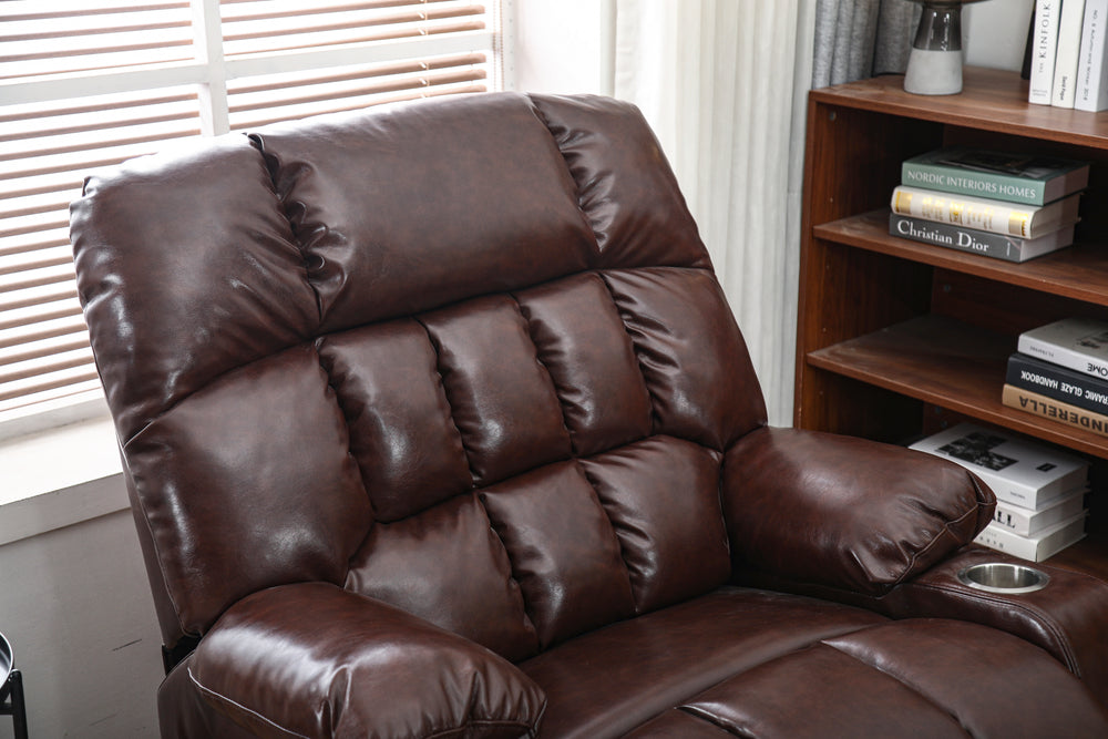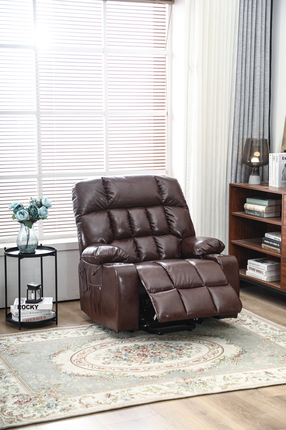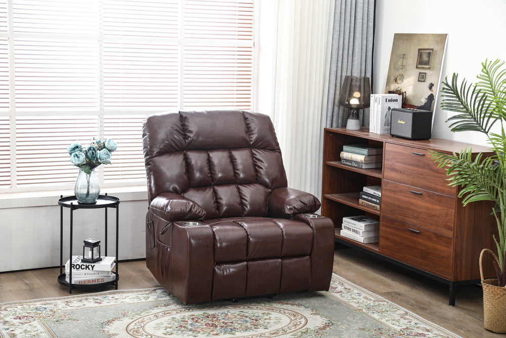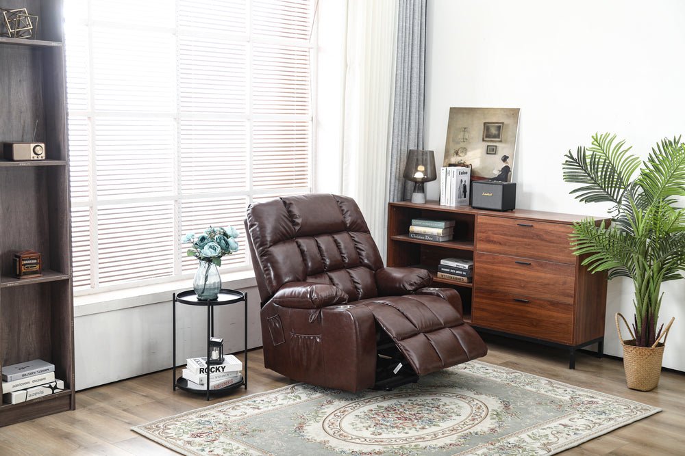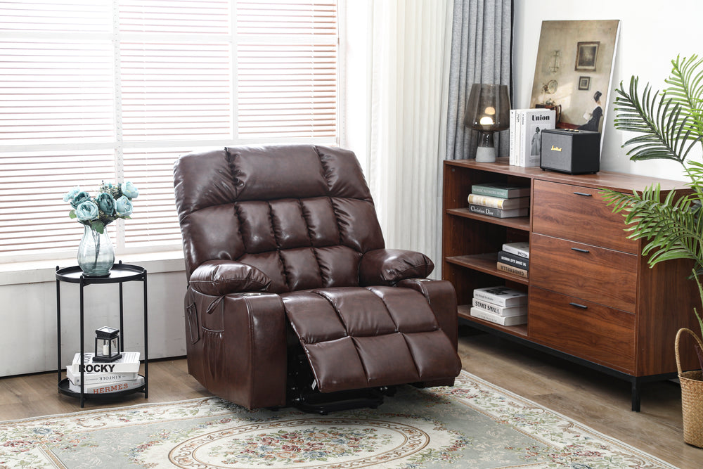 Designed specifically to support seniors and those with limited mobility, this power lift recliner chair combines advanced functionality with premium comfort. The chair features a powerful yet silent UL-approved German OKIN lift motor that gently elevates to assist standing, reducing strain on knees and back. Upholstered in soft brown PU with high-density foam cushioning, it provides exceptional support for the head, back, waist, and legs. The chair reclines smoothly up to 170 degrees, allowing you to find the perfect position for reading, watching TV, or resting. Enhanced with an integrated back and leg massager equipped with heat and multiple massage modes, it delivers soothing relief right where you need it. Plus, the formaldehyde-free, eco-conscious wood foundation ensures a healthy living environment. Elevate your relaxation and independence today with this expertly designed lift chair.