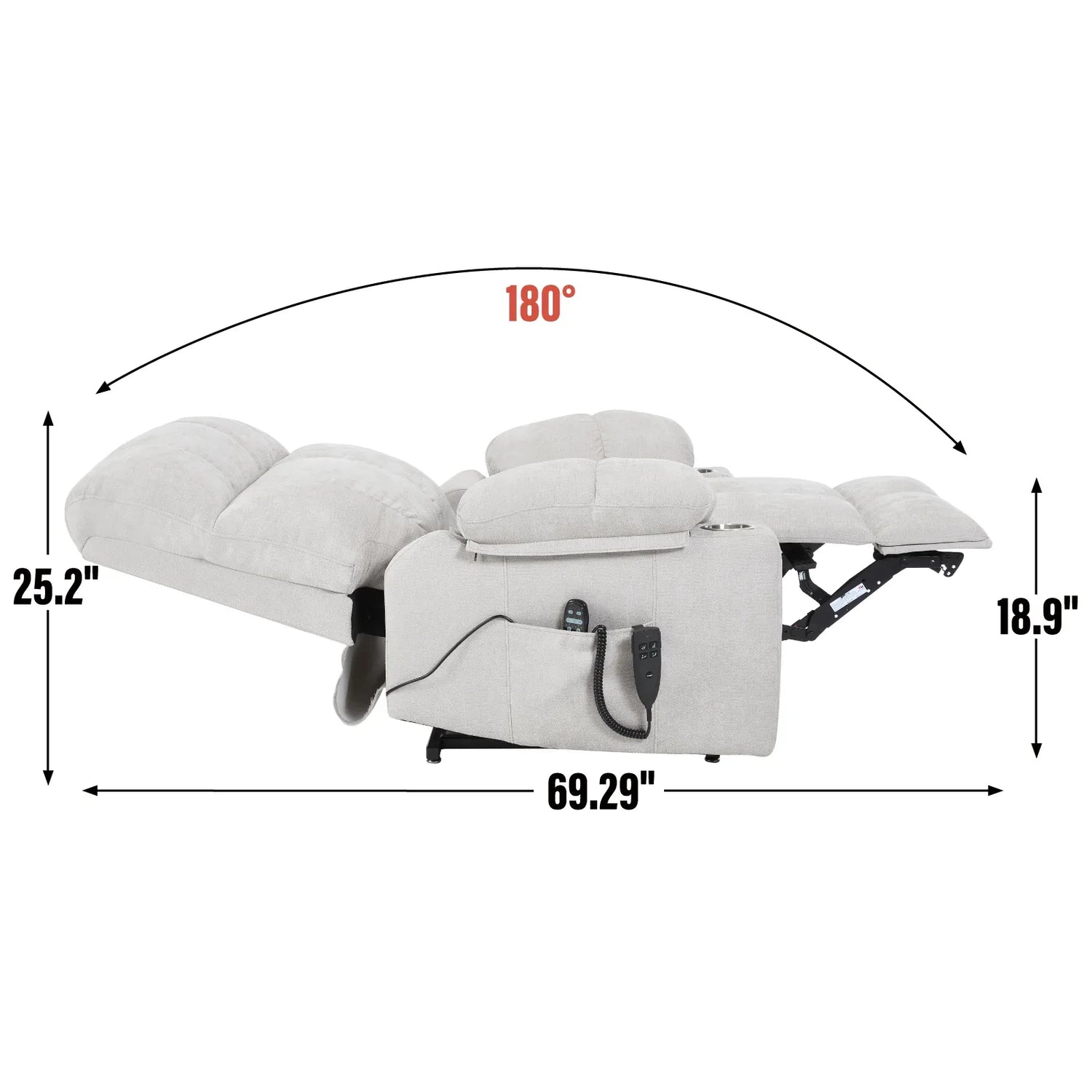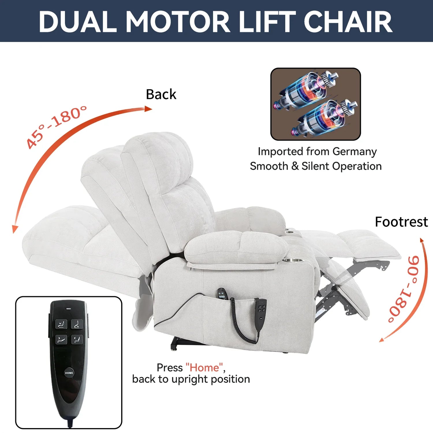 Designed for comfort and functionality, this oversized power lift recliner chair supports up to 350 lbs and features plush chenille upholstery in a soothing beige tone. The dual motor system offers infinite positioning, allowing you to recline nearly flat or lift smoothly to assist standing. Integrated 8-point vibration massage with adjustable modes targets key areas like the back, lumbar, thighs, and legs, while lumbar heating enhances circulation and soothes muscle tension. Crafted with a sturdy metal and pine wood frame and filled with fiber foam and polyester pads, this chair combines durability with medium-firm support for all-day comfort. Dual cup holders and side pockets provide convenient storage, making it ideal for your primary living space. Elevate your relaxation today with a chair designed to support your lifestyle.