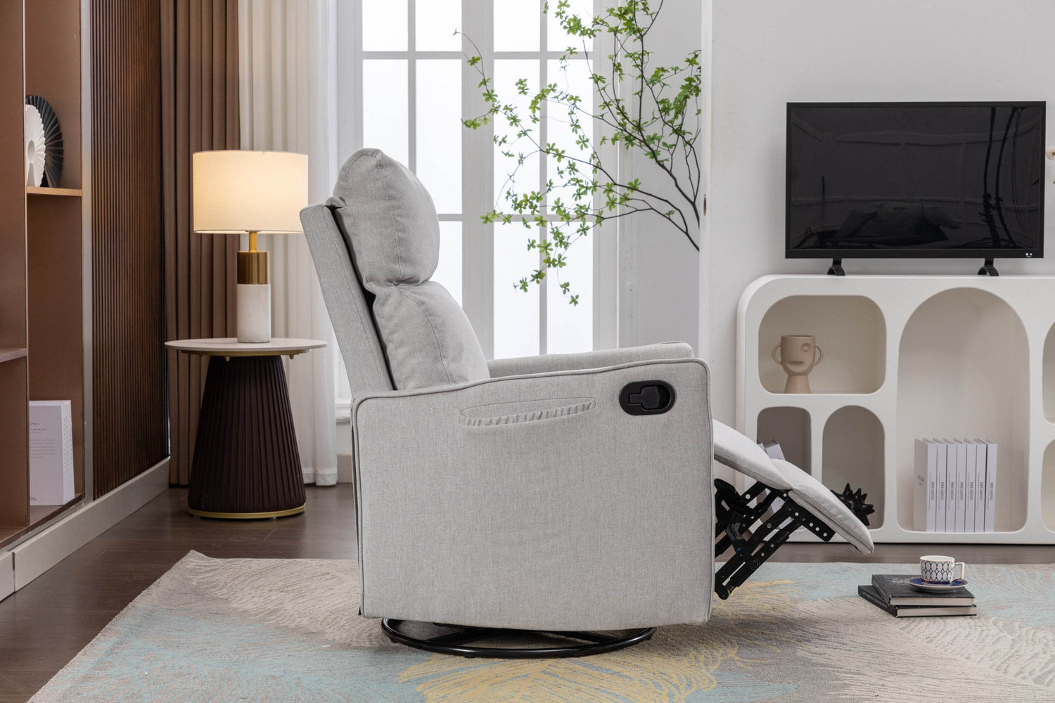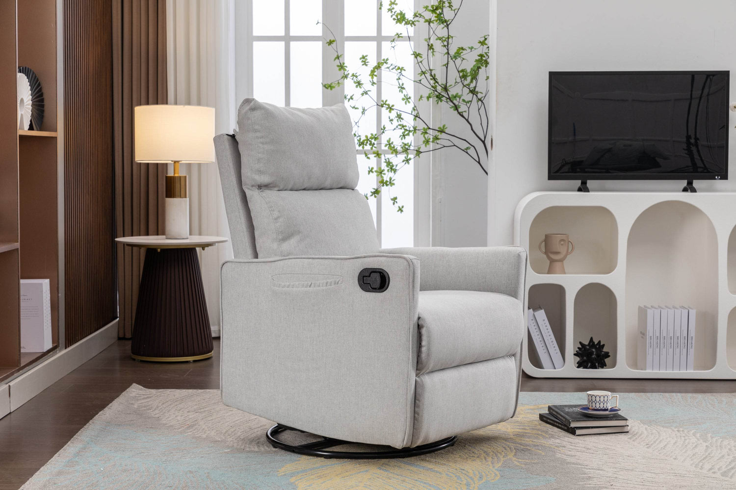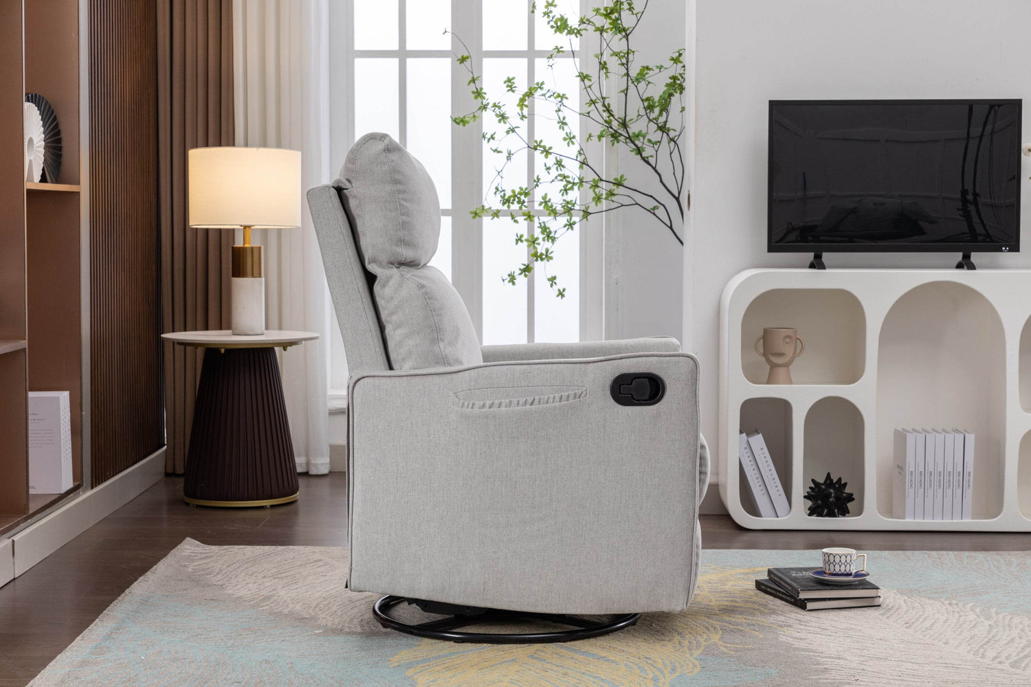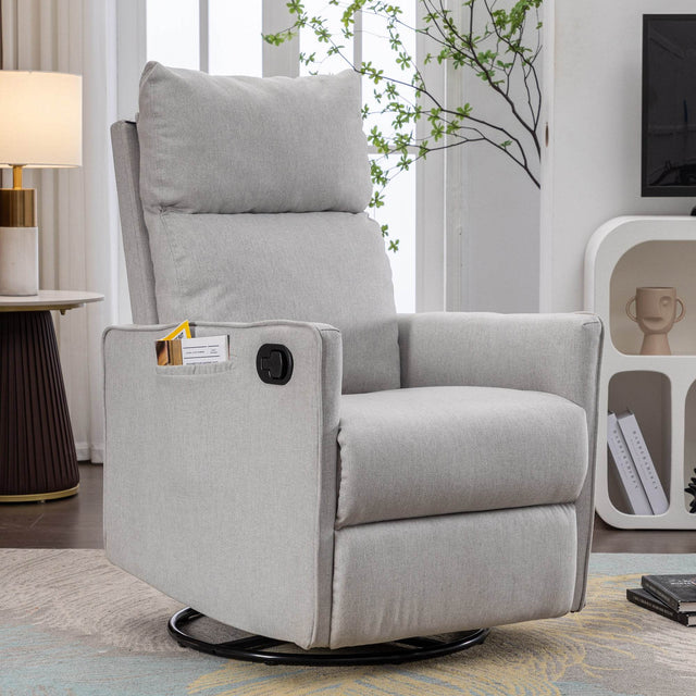Relax and unwind in style with this modern swivel rocking chair upholstered in breathable cotton linen fabric. Designed for your primary living spaces, it combines a soft foam-filled seat with a durable metal frame to provide plush comfort and long-lasting support. The chair’s 360° swivel and smooth rocking motion create a versatile seating experience, perfect for nurseries, living rooms, or bedrooms. Easily adjust the backrest and footrest using the manual handle for personalized comfort. Its light gray tufted back offers a contemporary look that complements any décor while the right-side storage pocket keeps essentials within reach. Weighing 73 pounds, this chair assembles quickly so you can enjoy it in minutes. Elevate your relaxation today with this stylish and functional glider recliner.