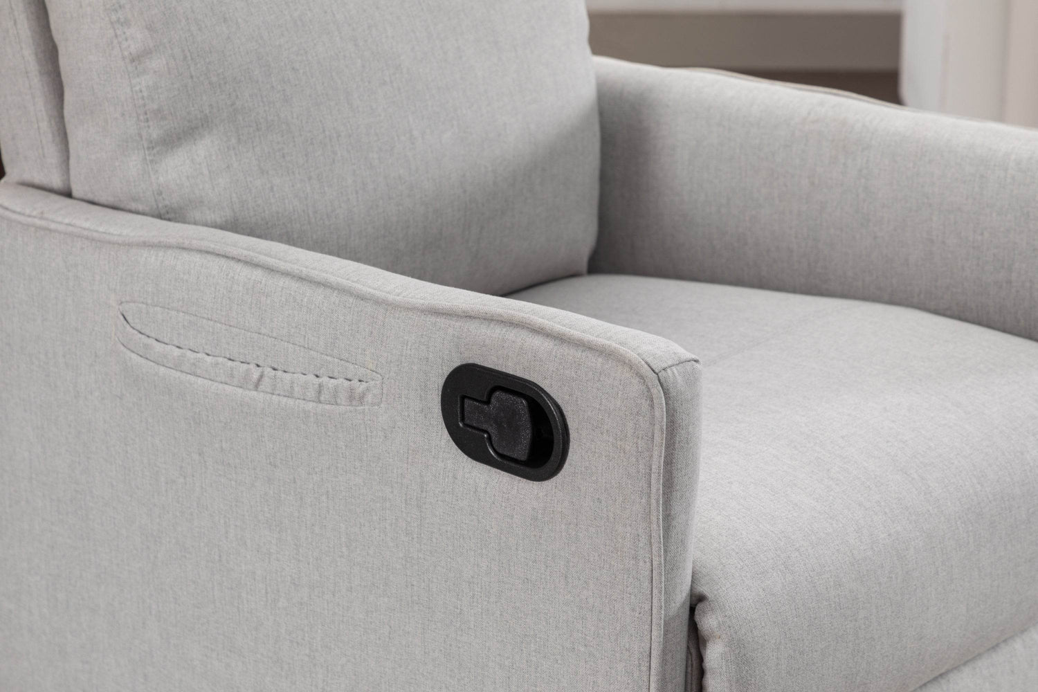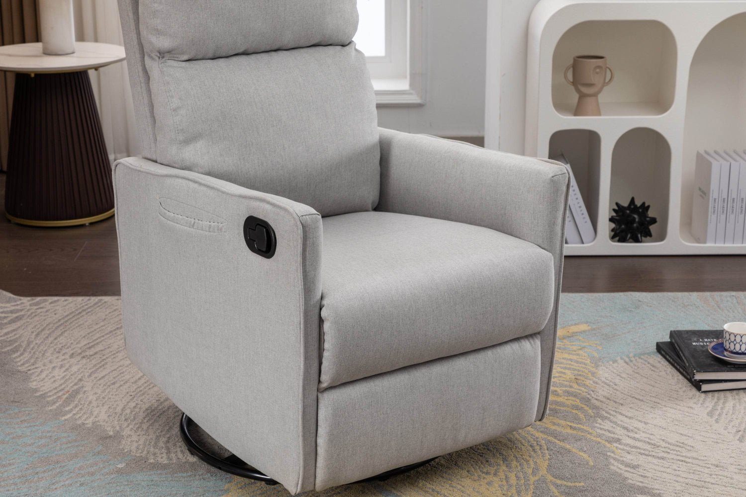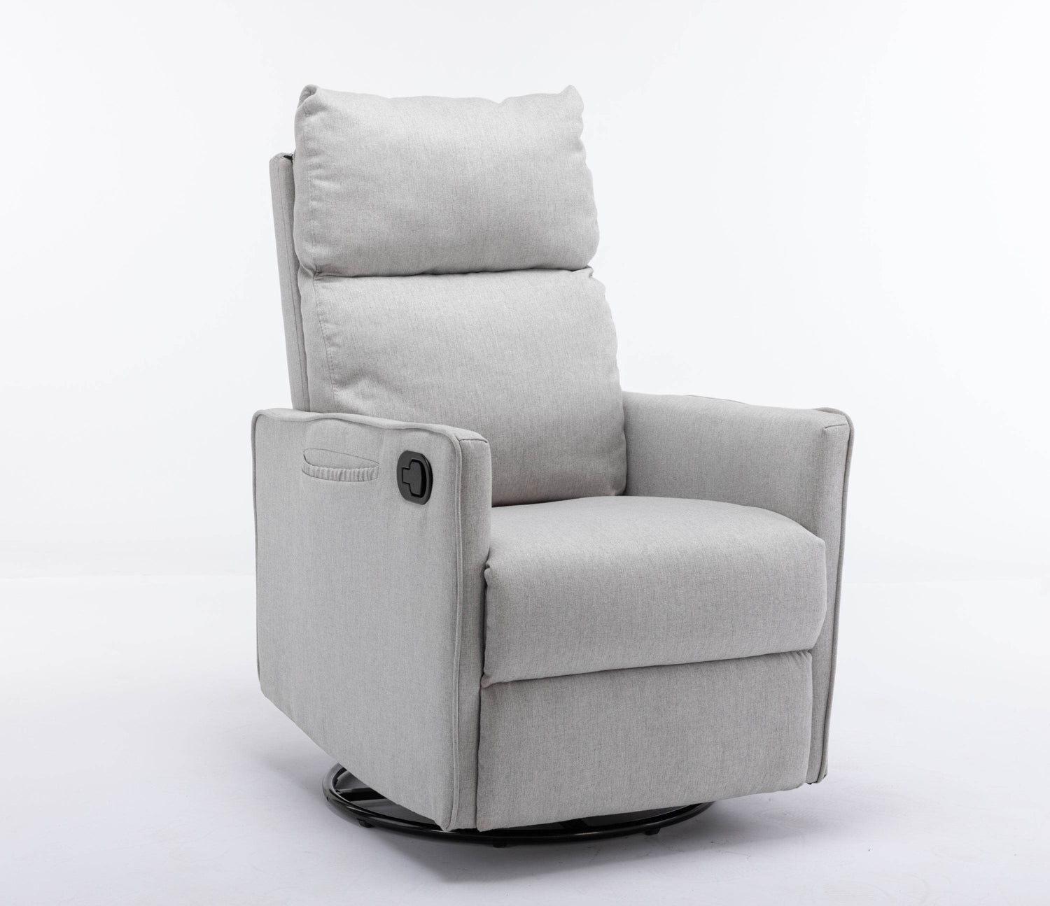 Relax and unwind in style with this modern swivel rocking chair upholstered in breathable cotton linen fabric. Designed for your primary living spaces, it combines a soft foam-filled seat with a durable metal frame to provide plush comfort and long-lasting support. The chair’s 360° swivel and smooth rocking motion create a versatile seating experience, perfect for nurseries, living rooms, or bedrooms. Easily adjust the backrest and footrest using the manual handle for personalized comfort. Its light gray tufted back offers a contemporary look that complements any décor while the right-side storage pocket keeps essentials within reach. Weighing 73 pounds, this chair assembles quickly so you can enjoy it in minutes. Elevate your relaxation today with this stylish and functional glider recliner.