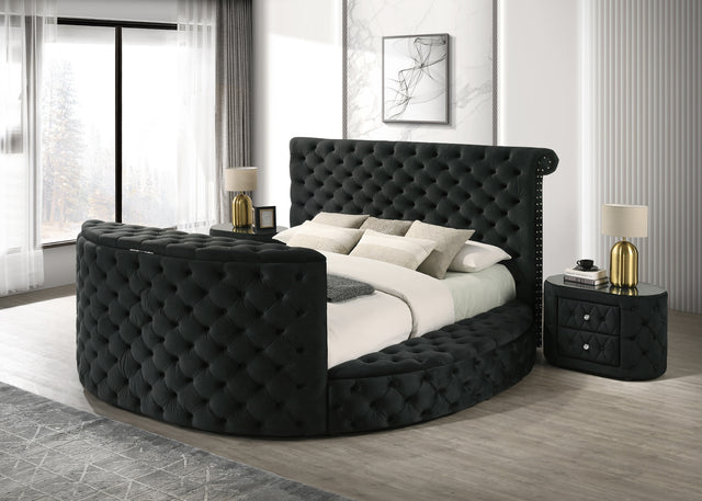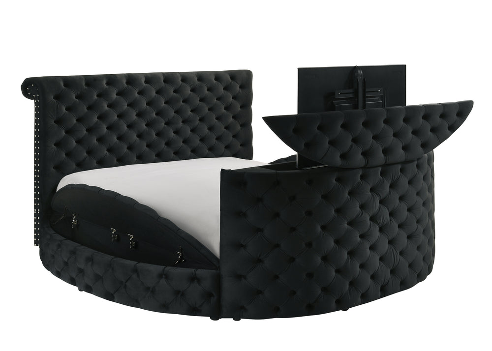 Elevate your bedroom with this ultra-modern 3-piece set featuring a queen size bed and two matching nightstands. The deeply tufted headboard, upholstered in rich black velvet with nail head trim, brings a sophisticated touch to your space. Enjoy seamless entertainment with the integrated television lift mechanism built into the footboard, perfectly accommodating 32" to 40" TVs. Cozy ambiance is yours year-round thanks to the built-in electric fireplace that adds warmth and style. Crafted from solid wood and fabric upholstery, this set blends durability with luxury. The nightstands showcase oval shapes with 8mm tempered glass tops and button tufted fabric, offering both functionality and refined aesthetics. Discreet storage options keep your bedroom neat while maintaining the set’s sleek design. Designed to transform your bedroom into a modern retreat, this bed and nightstand set invites you to unwind in style and comfort. Elevate your relaxation today.