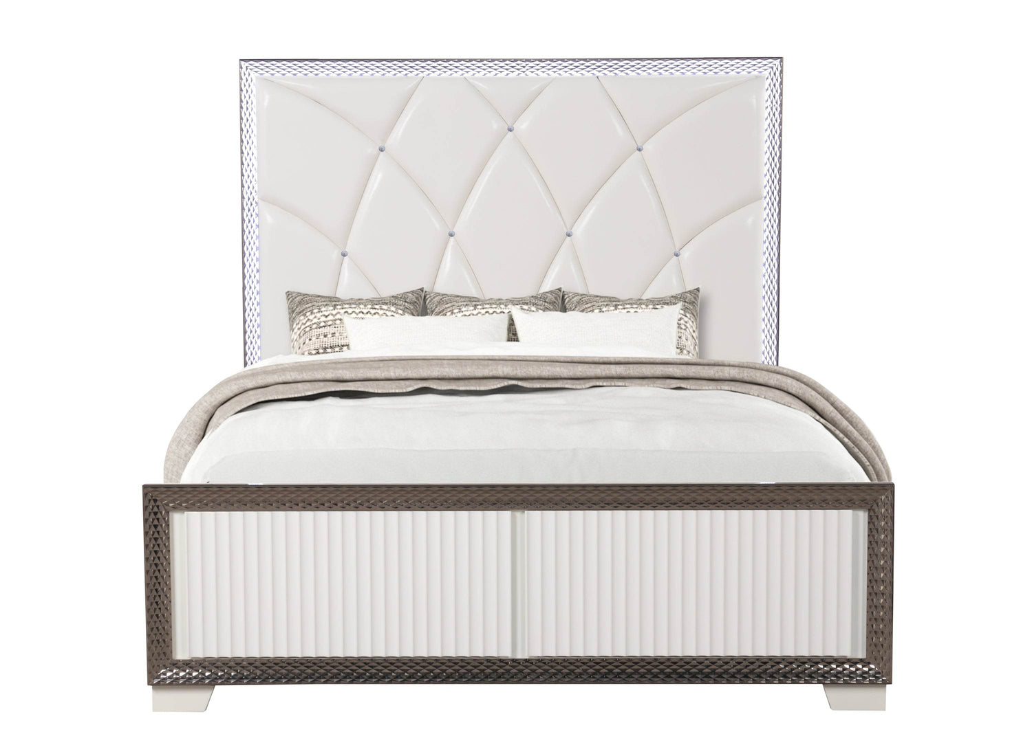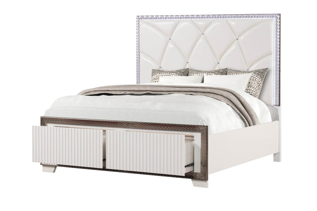 Elevate your bedroom style with the Fabio Contemporary Queen Bed, blending modern design and functional features for a stunning centerpiece. Crafted from durable acacia wood with a white finish, this bed frame showcases a tufted faux leather headboard accented by diamond-shaped side details enhanced with built-in LED lighting. The ambient glow creates a warm, inviting atmosphere, perfect for relaxing evenings. Its footboard mirrors the headboard's design and includes two spacious storage drawers, ideal for keeping linens and essentials organized without sacrificing style. Designed with sturdy support slats, the bed provides reliable stability and comfort while eliminating the need for a box spring. Measuring 88 inches long by 63.5 inches wide and 68 inches high, this queen bed frame transforms your bedroom with contemporary charm and smart storage. Upgrade your sleep space and enjoy lasting quality with this eye-catching bed frame—elevate your relaxation today.