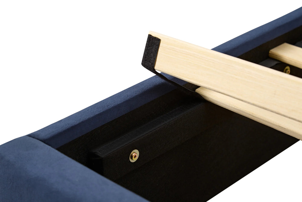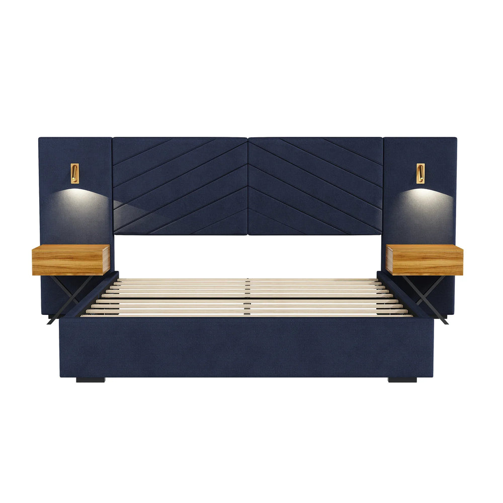 Elevate your bedroom with this modern velvet bed frame featuring a sophisticated vertical channel tufted wingback headboard. Wrapped in soft, skin-friendly retro blue velvet, it offers a fresh, breathable feel that adds luxurious texture and timeless style. The sturdy wood frame combined with durable wooden slats provides strong support for mattresses up to 12 inches thick, eliminating the need for a box spring. Integrated with two adjustable LED bedside lights and nightstands, this platform bed ensures both functionality and ambiance for your nightly routine. Easy to assemble with clear instructions and organized mounting, this bed frame blends elegance with practicality. Transform your sleep space with this comfortable, durable, and fashion-forward bed frame—your perfect foundation for restful nights. Elevate your relaxation today.