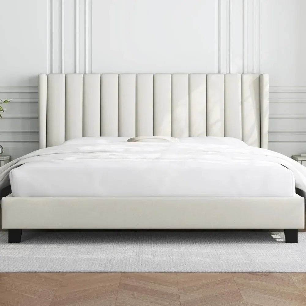Experience the perfect blend of classic design and modern comfort with this king size upholstered platform bed. Featuring a soft, linen fabric headboard with a tasteful wing edge design, this bed frame offers both elegant style and cozy support. The sturdy wood-metal construction ensures lasting durability and stability, accommodating up to 1,003 pounds. At 83 inches long, 78 inches wide, and 43.5 inches high, it provides a generous sleeping area with thoughtful details like protective foot pads to safeguard your flooring and reduce noise. Plus, 4.3 inches of under-bed clearance allows for easy cleaning and additional storage. Whether upgrading your master bedroom or adding a minimalist modern touch, this upholstered bed frame creates a welcoming and practical centerpiece. Elevate your relaxation and bedroom aesthetic today.
