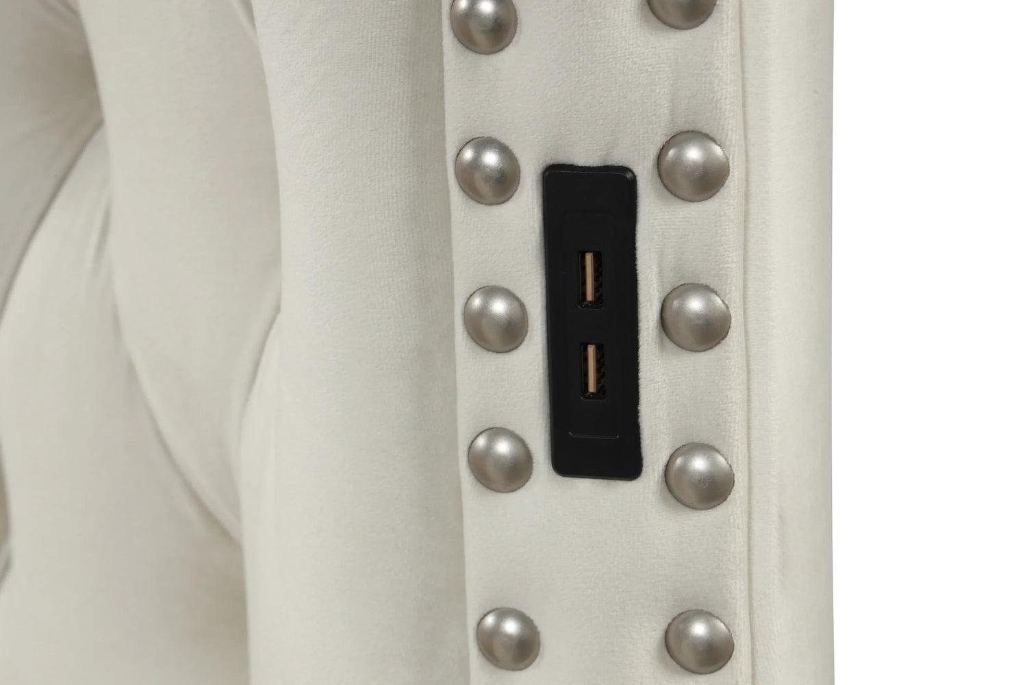 Experience a perfect blend of modern design and practical functionality with the HAZEL Queen Bed. Its cream velvet upholstery and button-tufted headboard add a touch of elegance and comfort to any bedroom. Built on a sturdy solid and manufactured wood frame, this bed ensures long-lasting durability without the need for a box spring. Thoughtfully designed with built-in storage in the side rails and footboard, it offers convenient space to keep your essentials close. Dual USB charging ports let you power your devices effortlessly, making it ideal for today’s connected lifestyle. This queen size slat bed measures 108 inches in length, width, and stands 58 inches tall, providing a spacious and stylish foundation for peaceful rest. Transform your sleep space with this statement piece and elevate your relaxation today.