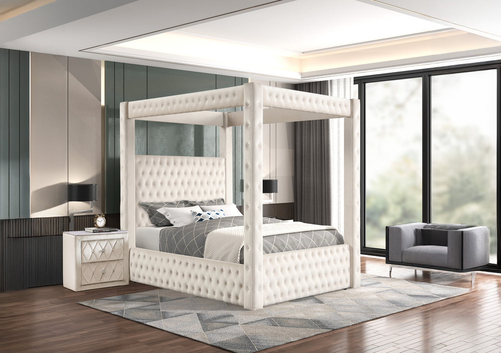 Experience Majestic Elegance with Our Ivory Velvet Four-Poster Queen Bed