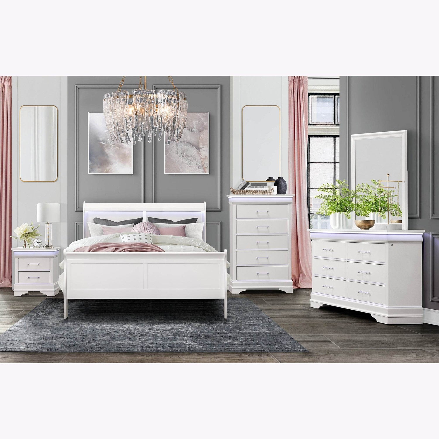 Elevate your bedroom with the Charlston Modern White King Bed, a perfect blend of style and functionality. Crafted from durable solid wood and MDF with a pristine white finish, this sleigh-style bed frame offers sturdy support for your box spring and mattress. Integrated LED lighting adds a sleek, ambient glow that enhances your room’s atmosphere while the spacious built-in drawers provide ample storage to keep your bedroom organized. At 78 inches long, 90 inches wide, and over 47 inches tall, this king-size bed brings a bold, modern statement to your space without compromising on comfort or practicality. Designed with high-quality rubberwood and wood fillers, it promises long-lasting durability and charm. Transform your bedroom into a serene retreat—elevate your comfort and style today.