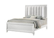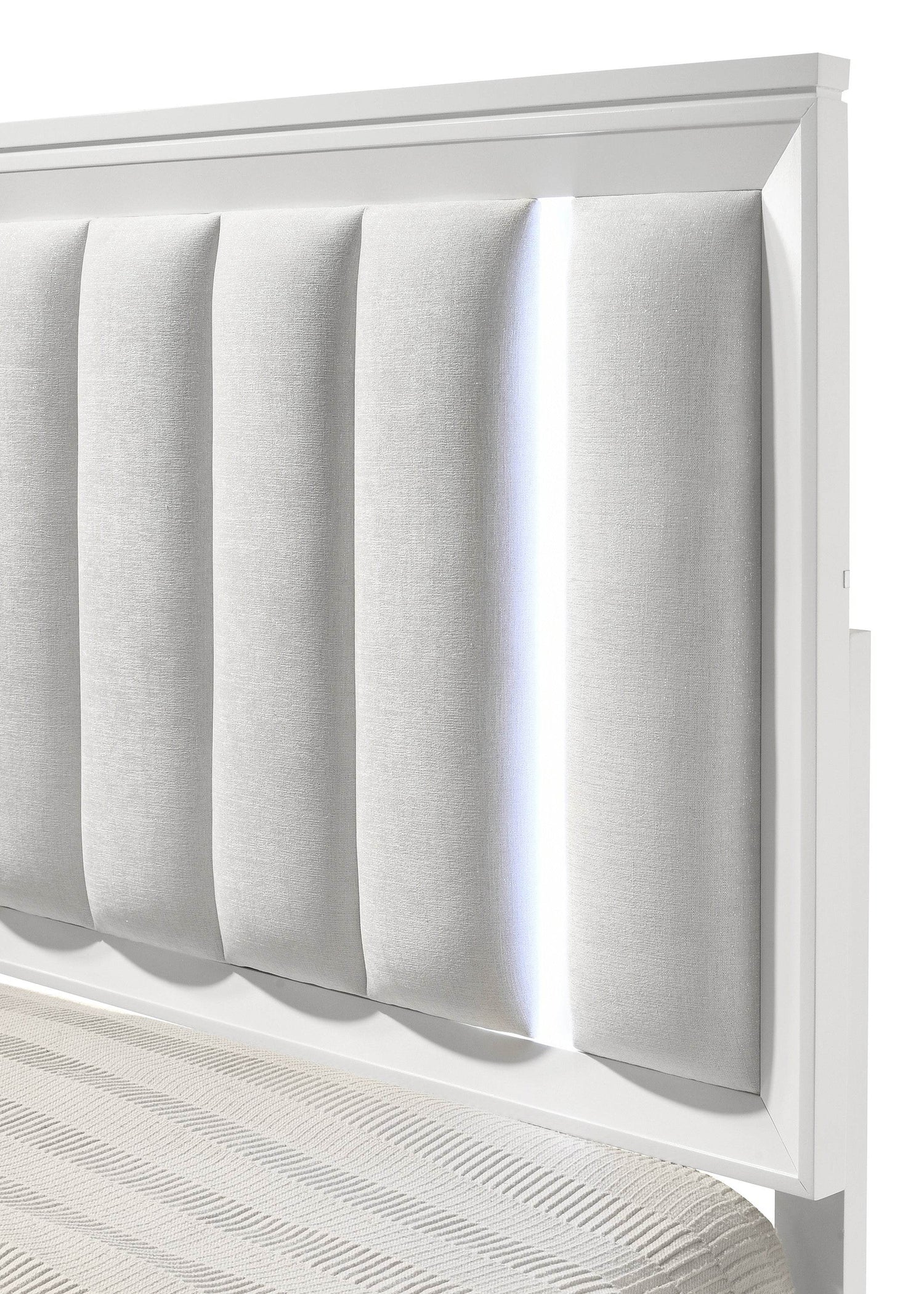 Make a bold style statement while enhancing your bedroom comfort with this queen panel bed crafted from durable solid wood. Its white finish complements modern and contemporary decor, while the upholstered cushion adds a plush touch to your headboard. Integrated LED lights on the headboard provide soft, ambient illumination to create a relaxing atmosphere, perfect for unwinding after a long day. The tapered front feet and low footboard design add sleek visual appeal without sacrificing stability. Designed for easy assembly, this bed requires a box spring (not included) and supports your mattress for restful nights. Upgrade your sleep space with this stylish and functional bed frame to enjoy lasting quality and comfort.