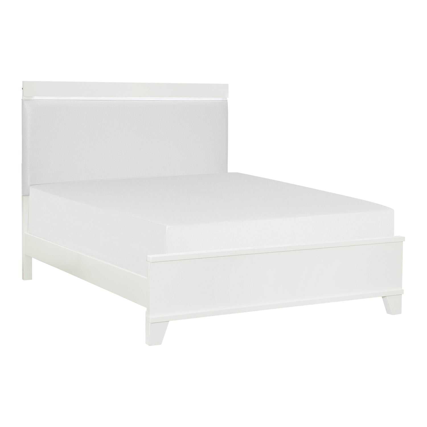 Modern queen panel bed features a white high gloss wood finish with a faux leather upholstered headboard illuminated by LED lighting, providing stylish bedroom ambiance. Includes headboard, footboard, and rails; foundation or box spring required for support.