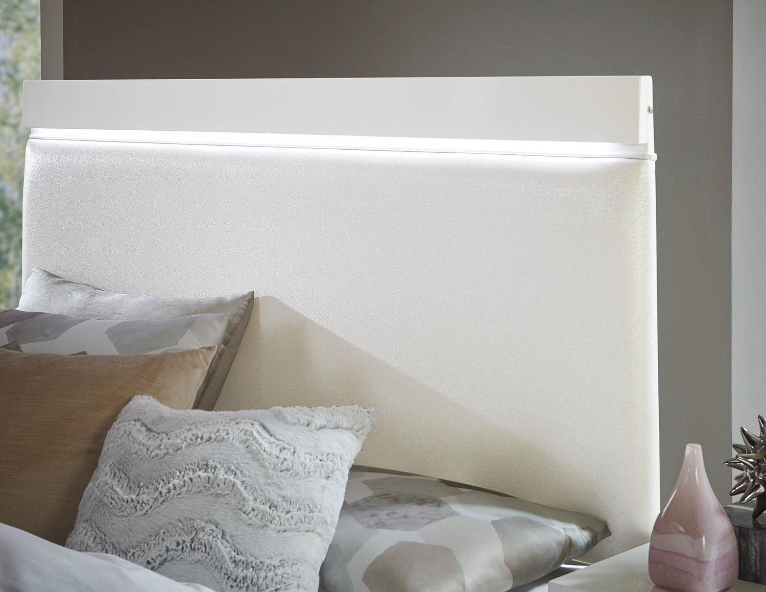 - Faux Leather Upholstered Headboard: Offers plush comfort with a stylish opalescent glow.