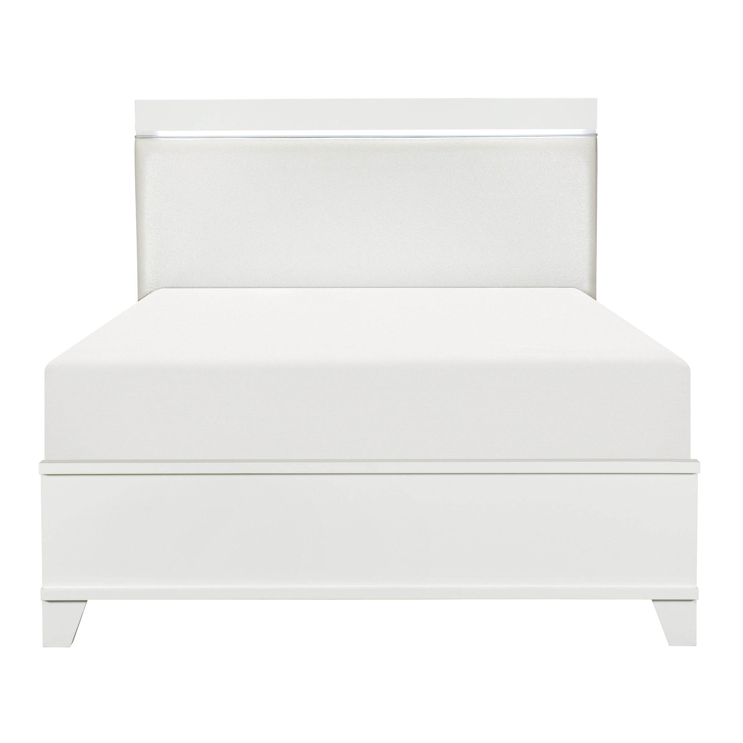 The Kerren Collection Queen Bed combines contemporary style and functional design to transform your bedroom. Crafted from durable wood and engineered wood, this panel bed features a sleek white high gloss finish that adds a bright and polished look to any space. The eye-catching faux leather upholstered headboard is accented with integrated LED lighting along the top rail, creating a soothing ambiance and modern flair that enhances your room’s atmosphere. Designed to support a queen mattress (not included), this bed requires a foundation or box spring for optimal comfort and durability. Its spacious 63-inch length by 85.75-inch width and 55-inch headboard height provide both presence and support without overwhelming your space. Elevate your relaxation and refresh your bedroom with this stylish and functional bed frame today.