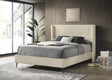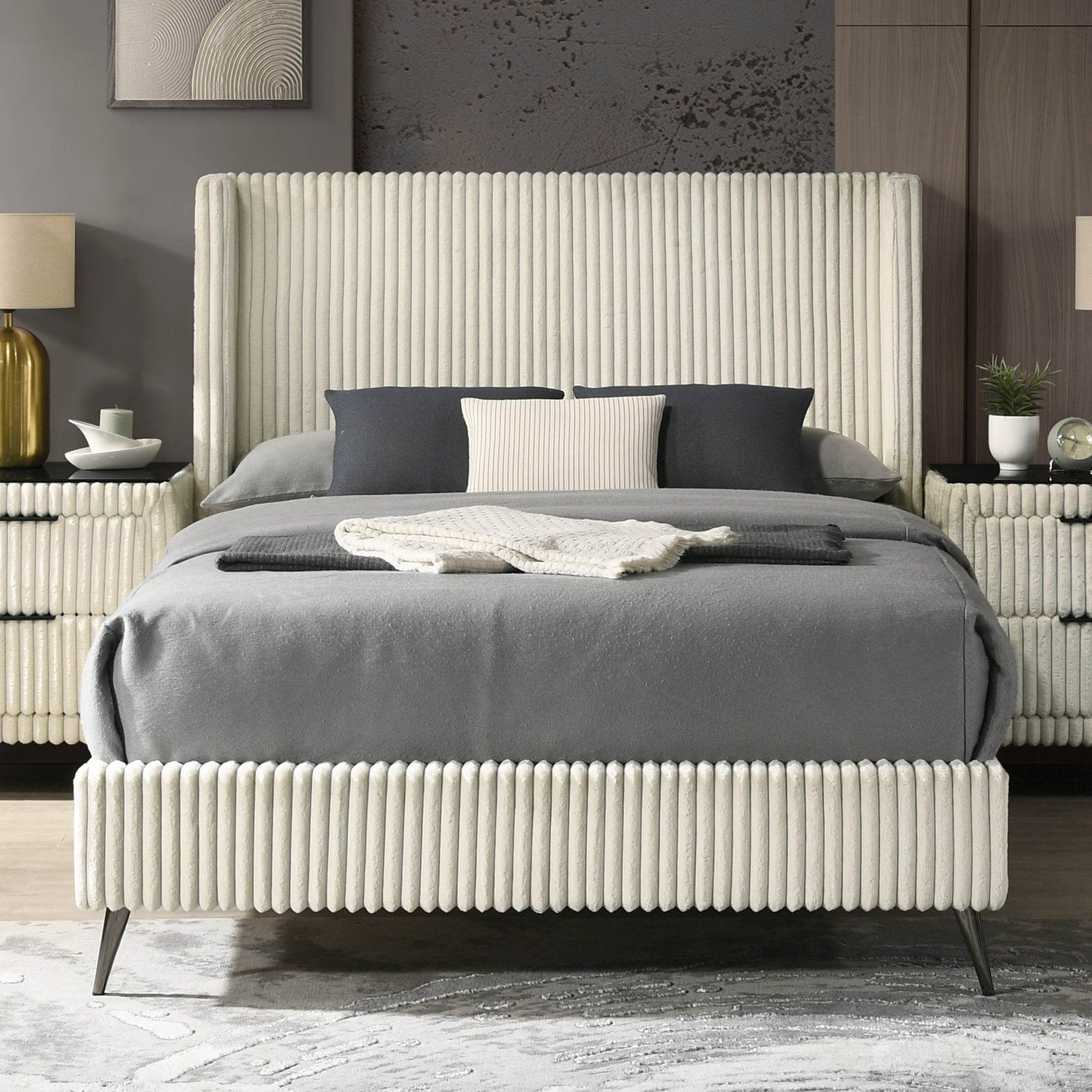 Mavela panel bed features wide wale corduroy upholstery in cream with a wing back headboard for comfortable reading or relaxing. Its modern design and sturdy wood frame support up to 500 lbs, ideal for contemporary bedrooms requiring a stylish, cozy centerpiece.