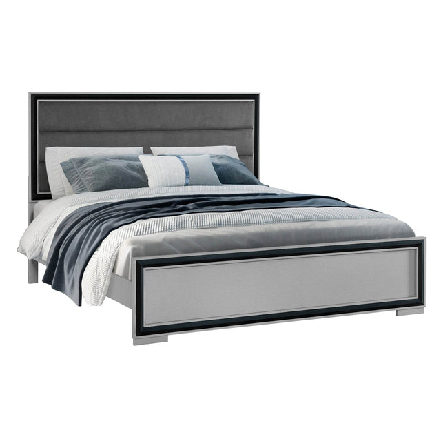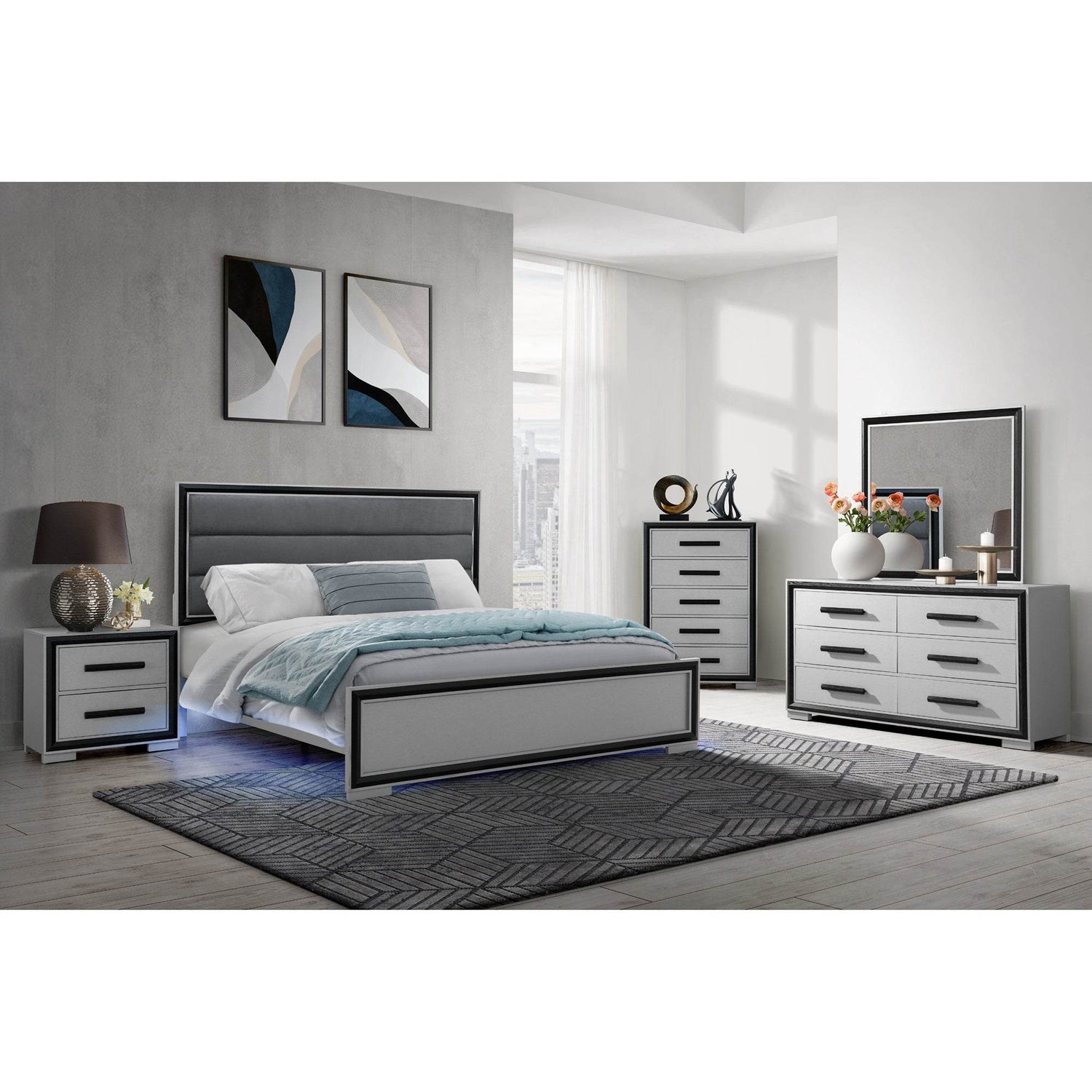 Experience contemporary style and functional design with the Adelaide Modern King Bed Frame. Crafted from durable solid wood and engineered MDF with a sleek grey and black finish, this bed frame adds a sophisticated touch to your bedroom. The upholstered headboard offers soft comfort for sitting up and relaxing, while integrated LED lighting creates a calming, modern ambiance. Designed to support a king-size mattress, it requires a box spring for optimal support and enhanced durability. With clean lines and black accent trims, this bed frame blends seamlessly into modern and minimalist decor schemes. Measuring 84.4 inches long, 79 inches wide, and 56 inches high, it provides a sturdy foundation weighing approximately 113 lbs. Upgrade your sleep environment and bring a stylish focal point to your home. Elevate your relaxation today.