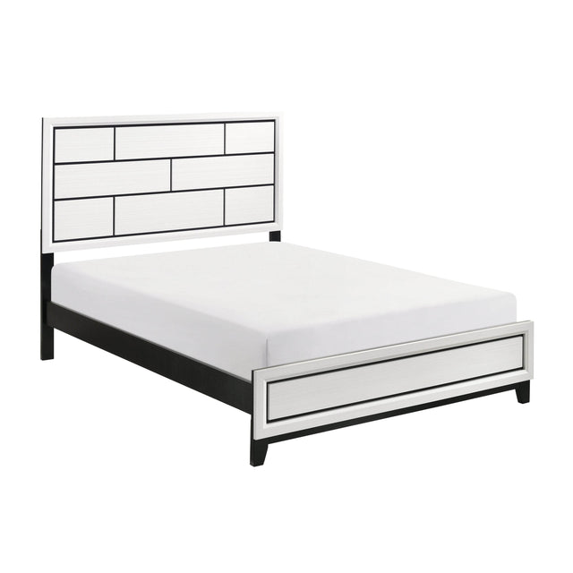 Modern contemporary California King bed features a white faux wood veneer finish with black line accents, including headboard, footboard, and rails. Made of wood and engineered wood, it requires a box spring and suits stylish bedroom setups.