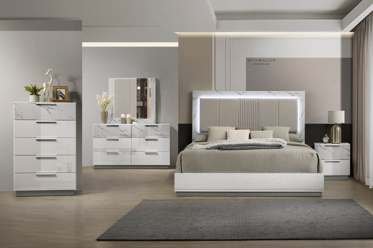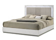 Elevate your bedroom with the Mist King Bed, a stunning blend of contemporary style and functional design. Crafted from durable wood and MDF with a sleek white lacquer finish, this bed frame serves as a sophisticated focal point. Its marble-inspired headboard combines minimalist beauty with plush padded comfort, perfect for lounging or reading. Integrated LED lighting adds subtle ambient glow, creating a serene atmosphere to unwind after a long day. Designed to accommodate a king-size mattress with box spring support, this bed frame brings timeless style and lasting quality to your bedroom space. Upgrade your sanctuary with this versatile, modern masterpiece.