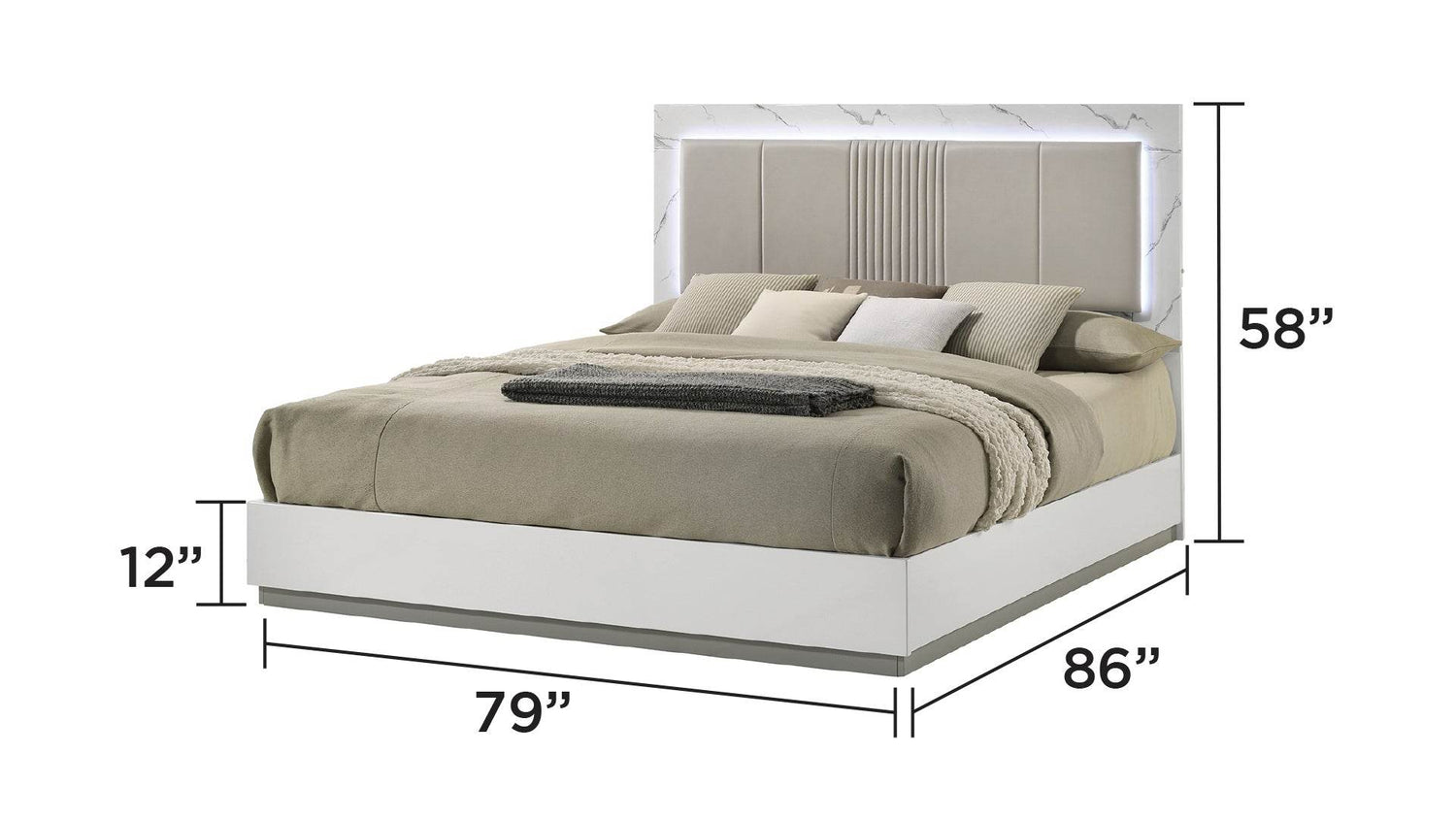 Modern bed frame features a durable white lacquer finish with a plush padded headboard and elegant marble-inspired panel. Integrated LED lighting enhances relaxation, while the wood construction offers long-lasting support. Ideal for bedrooms, available in multiple sizes, requires box spring.