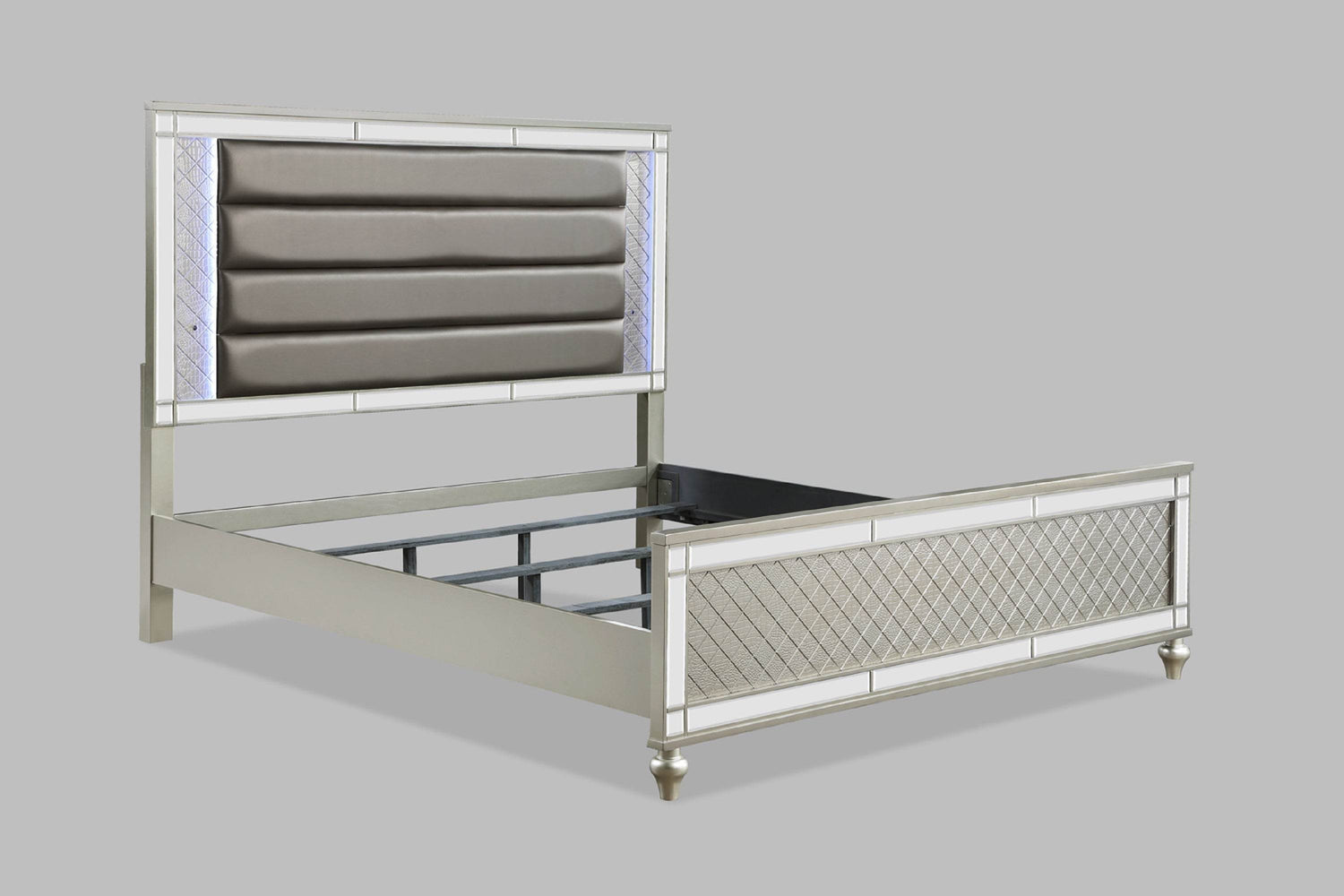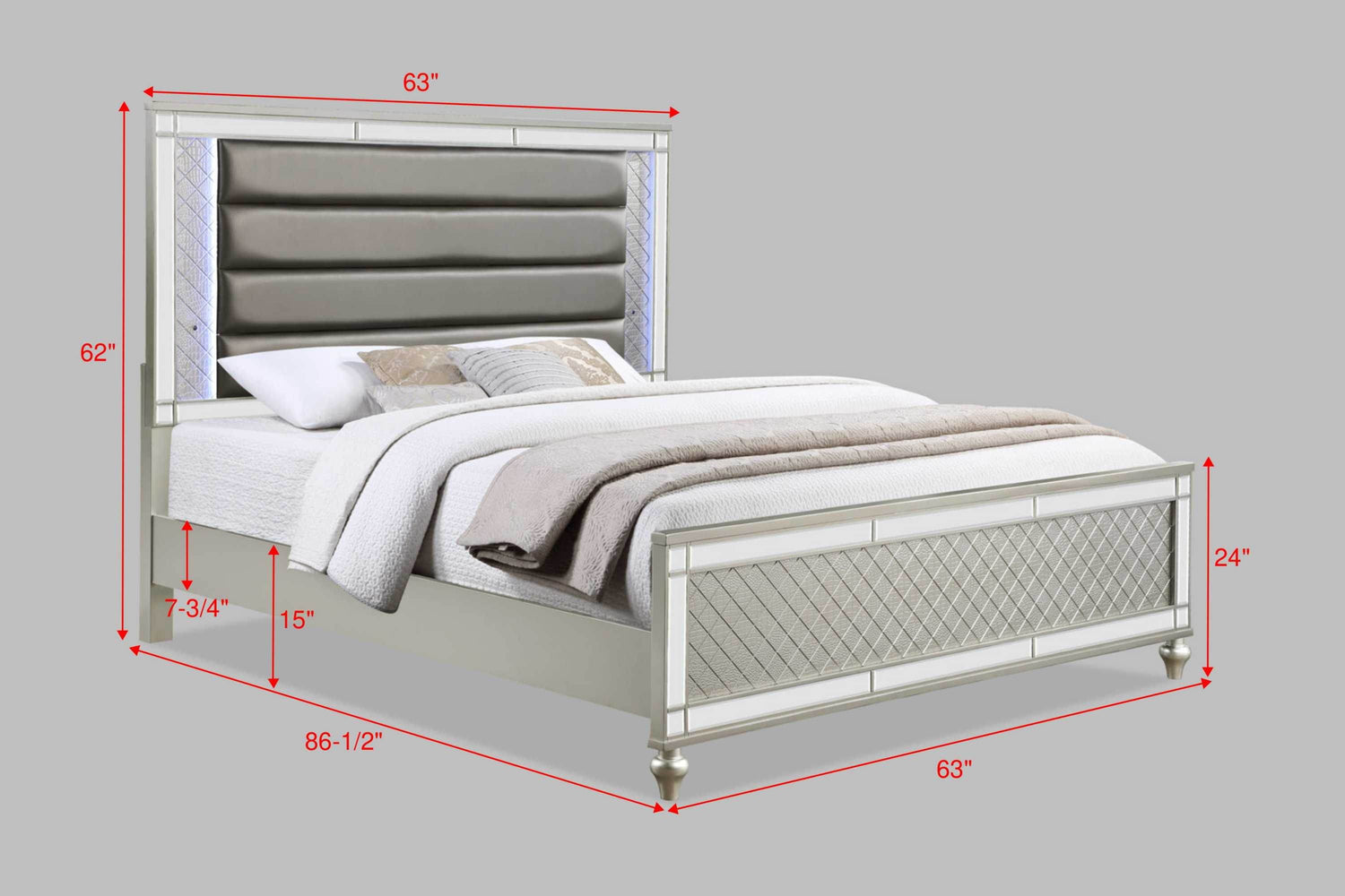 Bring sophistication and style to your rest space with this striking queen panel bed. Featuring a contemporary glam design, its champagne finish complements any modern décor effortlessly. The upholstered faux leather headboard with elegant X-shaped accent and embedded white & blue LED lights adds a captivating glow, setting a serene ambiance for relaxation. Mirror accents on the headboard and footboard enhance the room’s brightness and depth, while solid wood construction ensures lasting durability. This bed includes sturdy slats and support legs for reliable mattress foundation (box spring required). Easy-to-clean materials and simple assembly make it a practical yet luxurious addition to your bedroom. Upgrade your sleep sanctuary and enjoy restful nights with style—elevate your relaxation today.