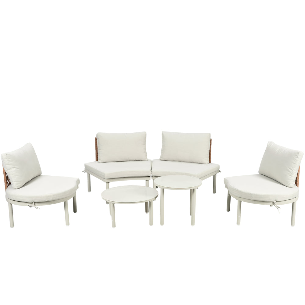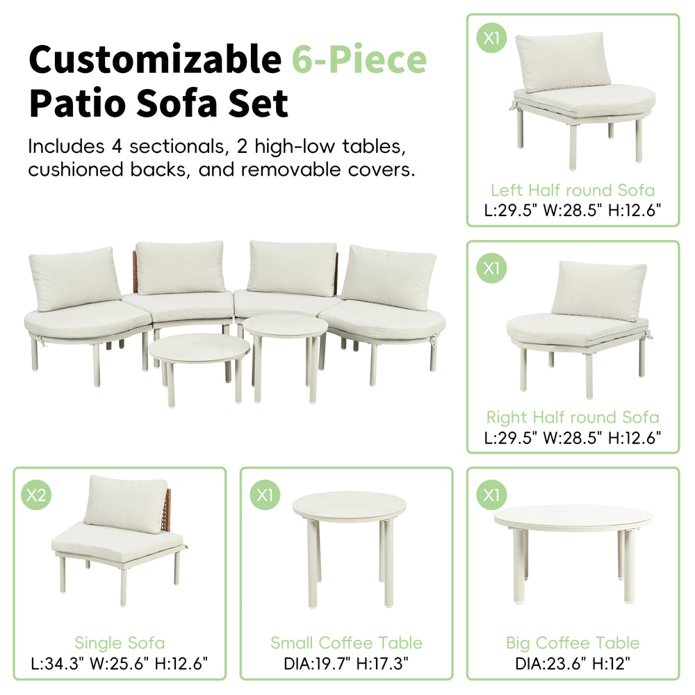 Create a stylish and comfortable outdoor oasis with this versatile 6-piece patio sofa furniture set. Featuring four armless half-moon sofas and two high-low round coffee tables with tempered glass tops, this sectional grouping offers modular freedom to design your perfect seating arrangement. Crafted with a durable aluminum frame and weather-resistant PE wicker rattan, the set is built to withstand outdoor elements while maintaining a modern look. Removable, water-resistant cushions and back pillows—including uniquely shaped half-round cushions—add plush comfort and convenience for relaxing in your backyard, garden, or poolside. Easy to clean and maintain, the sleek beige color palette blends seamlessly with any outdoor décor. Whether hosting friends or unwinding solo, this deep seating set brings elegance and durability to your outdoor space. Elevate your relaxation today.