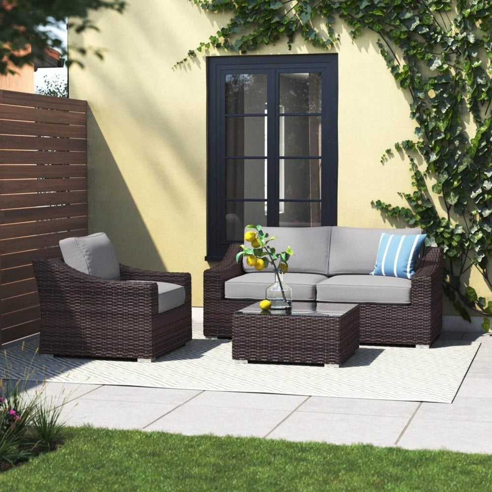 Upgrade your patio or balcony with this fully assembled 4-piece outdoor wicker sectional that combines style, durability, and comfort. Crafted with a rustproof aluminum frame wrapped in weather-resistant brown HDPE wicker, this set ensures year-round resilience against the elements. Plush gray marine-grade olefin cushions with 5-inch (13 cm) thick high-resilience foam provide exceptional seating comfort, while zippered, machine-washable covers offer easy upkeep. Featuring gently sloped backrests and a sleek glass-topped end table, this compact conversation set is perfect for intimate gatherings or relaxing solo. With no assembly needed and commercial-grade durability, it’s an ideal choice for enhancing any outdoor space with lasting quality and effortless style. Elevate your outdoor relaxation today.