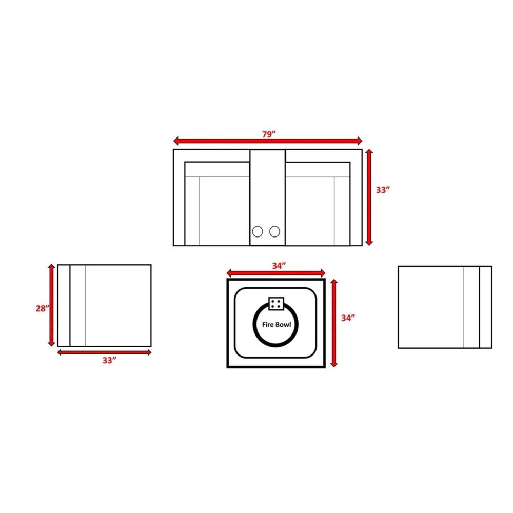 Outdoor sectional seating group with weather-resistant resin wicker frame and plush 5-inch water-resistant cushions includes fire pit with 40,000 BTU output. Fully assembled for effortless setup, ideal for patio lounging and entertaining with seating for four.