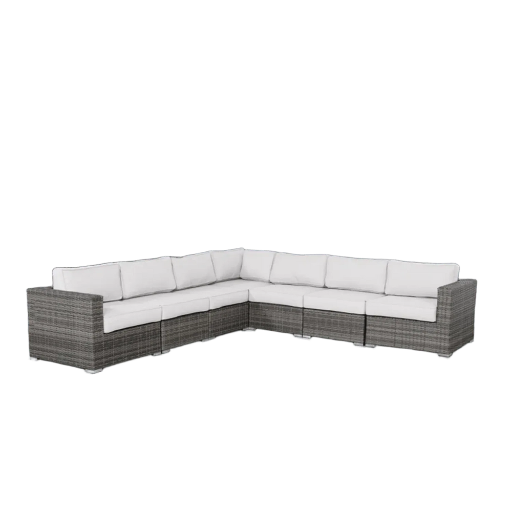 Elevate your outdoor living space with this spacious 122-inch L-shaped wicker patio sectional, crafted for both style and comfort. Designed to comfortably seat up to six people, it’s ideal for entertaining guests or enjoying quiet afternoons in your garden or on your deck. Handwoven from durable, all-weather HDPE wicker in a versatile mixed gray finish, this sectional offers a modern look while resisting the elements. Built on a rustproof aluminum frame, it ensures long-lasting strength and stability. Plush 5-inch thick foam cushions with water- and mildew-resistant fabric promise soft seating and easy upkeep, thanks to removable, machine-washable covers. The modular and reversible design allows you to adapt the sectional to your space. Delivered fully assembled, you can start relaxing outdoors right away. Transform your patio into a comfortable retreat — elevate your relaxation today.
