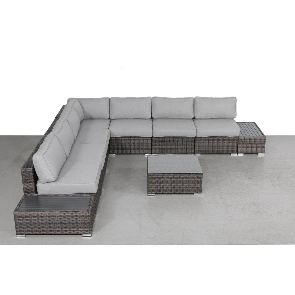 Transform your patio into an inviting retreat with this fully assembled 10-piece wicker sectional set designed for six people. The oversized modular sofa features a reversible layout, allowing you to customize your seating arrangement to fit any space. Plush 5-inch thick cushions in stylish Olefin Grey provide exceptional comfort, crafted from open-cell foam for breathable support. Built to last, the rust-resistant aluminum frame is wrapped in durable half-round HDPE wicker that withstands weather, UV rays, and moisture year-round. Three sleek glass-top tables offer convenient surfaces for drinks and snacks, enhancing outdoor gatherings. With removable, machine-washable cushion covers, maintenance is effortless. Elevate your outdoor living experience today with this elegant, weatherproof sectional designed for style and relaxation.