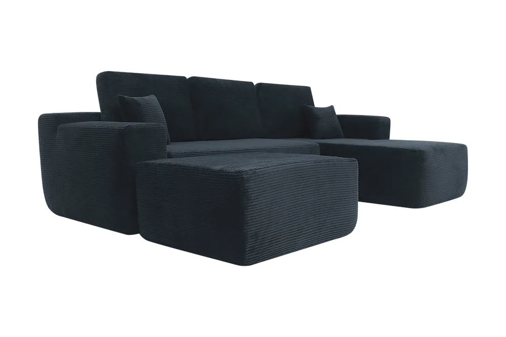 This modular sectional sofa features plush corduroy fabric and high-resilience foam filling for deep, cloud-like comfort. With a reversible chaise lounge and no assembly required, it suits living rooms or bedrooms seeking stylish, relaxing seating for three.