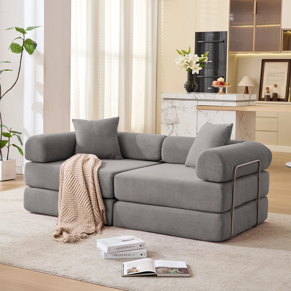 Modular folding sofa bed features four movable corduroy-upholstered modules with foam and pocket spring fill, offering flexible seating or full mattress layout. It requires no assembly, saves space, and suits small apartments or primary living areas with soft, comfortable seating for two.