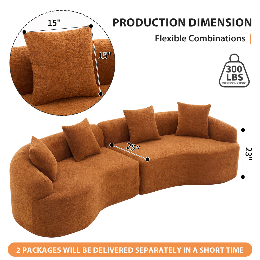 Enhance your living space with this vibrant orange 4-seat modular sectional sofa, designed for both style and comfort. Crafted with high-density 30D foam and integrated springs, it offers medium-soft support ideal for relaxing, seating guests, or even sleeping. The curved shape and plush chenille upholstery create an inviting atmosphere that complements modern and exotic American-style decor. Its pillow back design promotes ergonomic comfort, while the all-foam, corner-free construction ensures safety for families with children and pets. Measuring 110.2 inches long, 39.4 inches wide, and 25.6 inches high, this sofa fits perfectly in apartments and primary living rooms. Enjoy easy setup with no assembly required, plus flexible movement since each section is separate—perfect for maneuvering tight spaces. Elevate your home relaxation and add a pop of color with this unique curved sectional today.