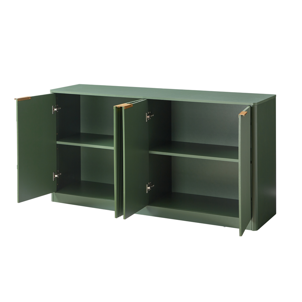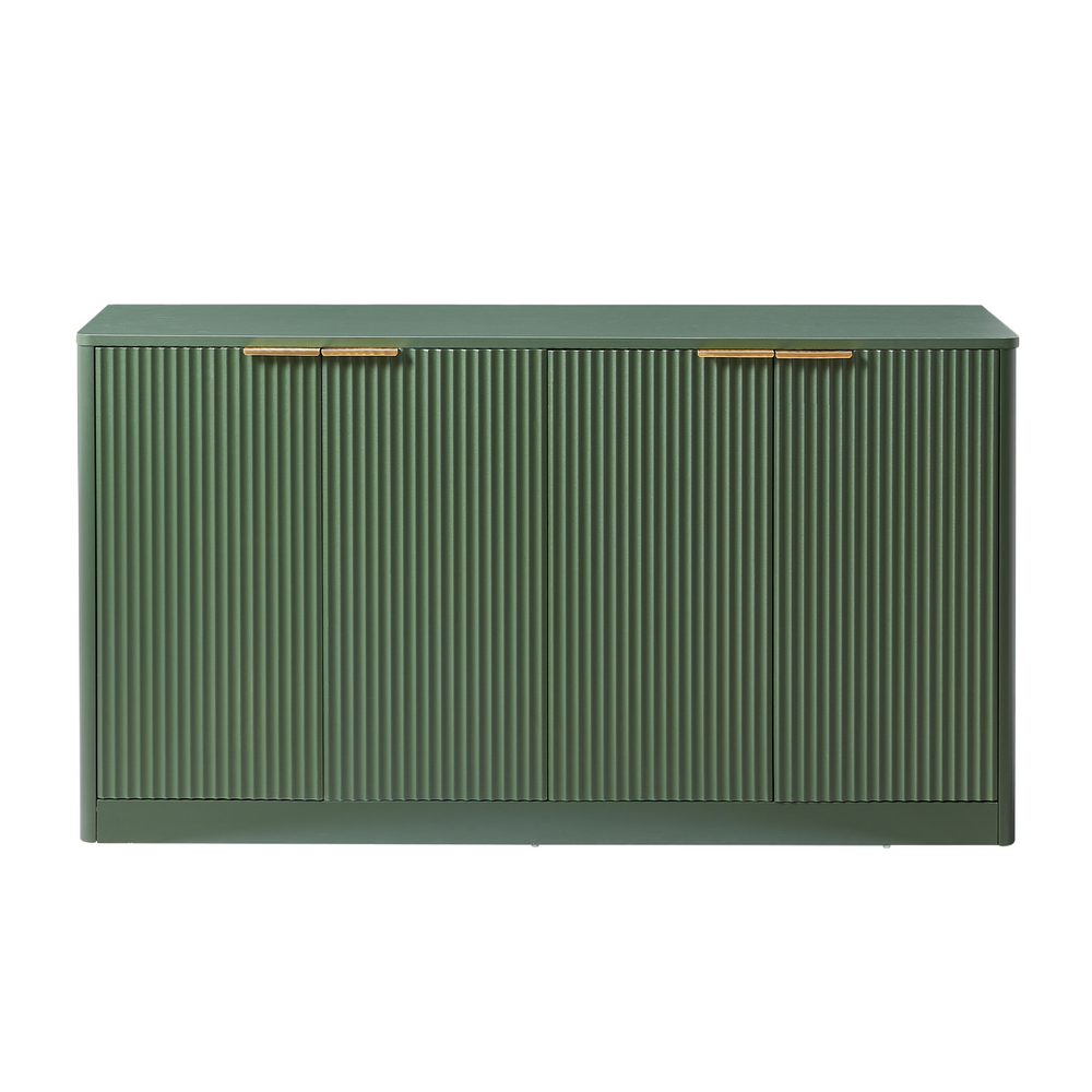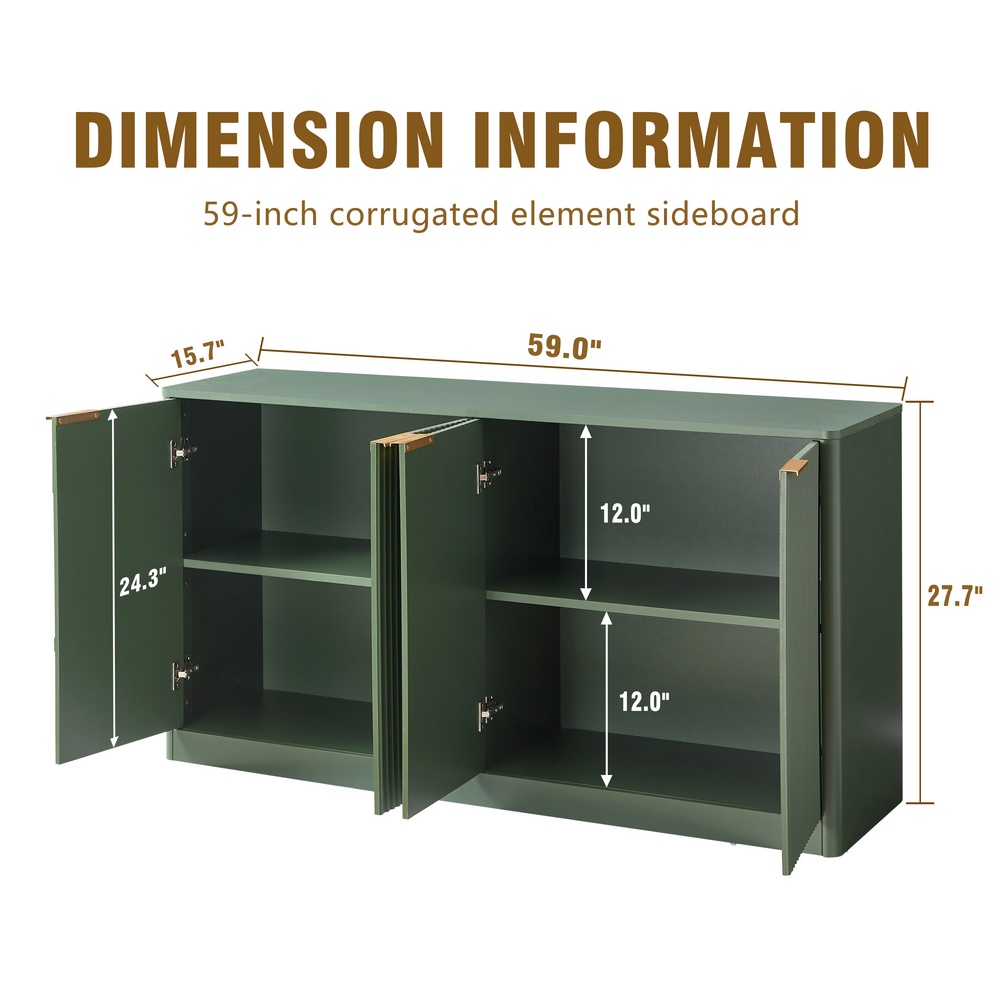 Bring sophistication and functionality to any room with this stylish 59-inch green sideboard featuring a unique wavy curved contour design. Crafted from durable MDF, its rustic wood-grain tabletop pairs beautifully with the modern wave-shaped panels for a striking vintage-modern blend. This versatile storage cabinet offers ample space behind four spacious doors, perfect for organizing everyday essentials like books, games, or diningware. Use it as a TV stand, coffee table, or elegant sideboard to enhance your living room, kitchen, bedroom, or foyer. With sturdy metal handles and floor protectors, this unit combines durability with visual appeal. Easy to assemble with clear instructions, it supports up to 300 pounds on top—ideal for your decor or entertainment needs. Enhance your space’s organization and style today.
