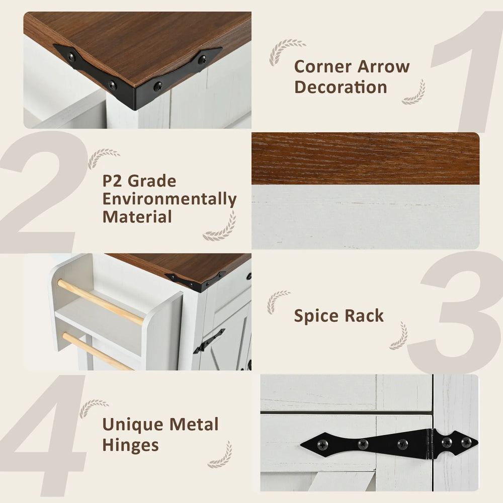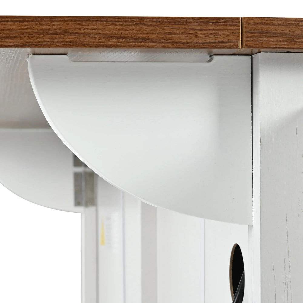 Bring rustic charm and practical functionality to your kitchen with this farmhouse-style kitchen island. Measuring 53.5 inches wide by 28.75 inches deep and standing 36.5 inches tall, it offers a spacious wood grain countertop perfect for meal prep or serving. The drop leaf design allows you to easily expand or fold down your workspace to save space when not in use. Crafted from eco-friendly P2 grade particleboard and MDF, it pairs distressed white cabinetry with classic brown tones and retro metal hardware, making it an inviting addition to any kitchen or dining area. Equipped with a built-in power outlet featuring 2 AC sockets and 2 USB ports, this island keeps your appliances and devices charged and ready. Thanks to five 360° rotating wheels—two lockable—it offers effortless mobility and stability. Ample storage with four doors, adjustable shelves, and two drawers lets you organize kitchen essentials efficiently. Elevate your kitchen storage and workspace today with this versatile and stylish kitchen cart.