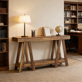 Farmhouse-style entryway table features natural wood finish and durable MDF construction with an A-frame design for stability. Includes two-tier storage for decor or organization, serving as a console, sofa, or entrance table, with easy assembly support.