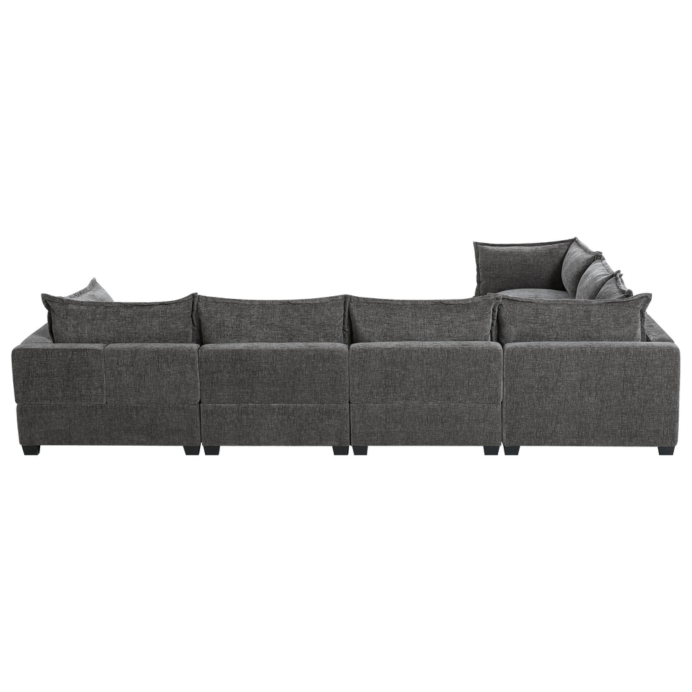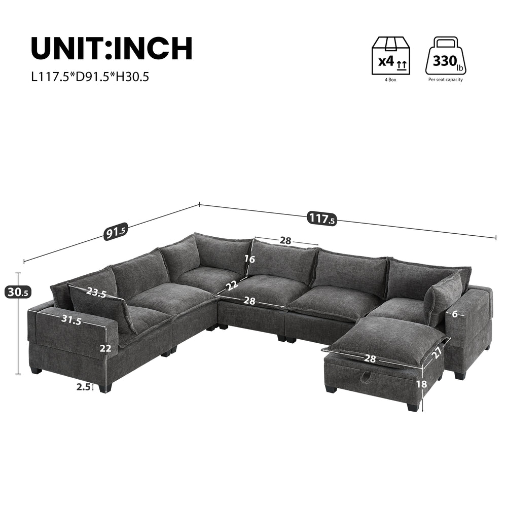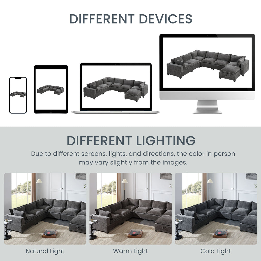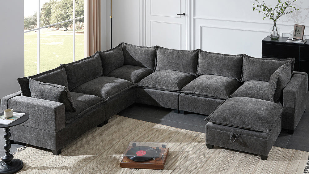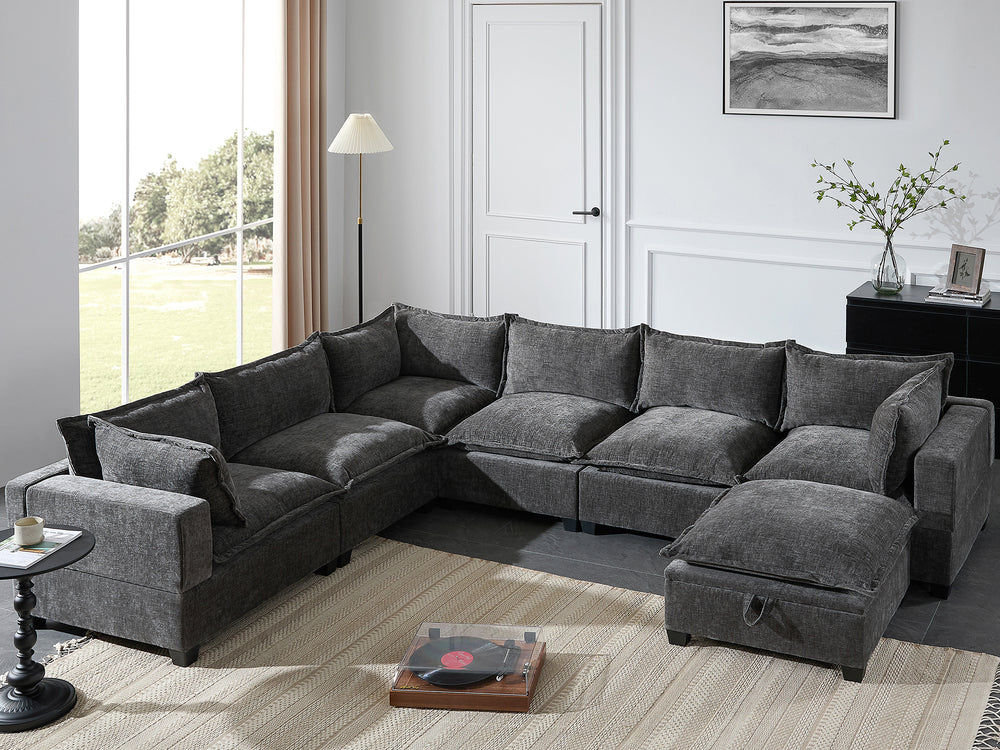 Enhance your living space with this versatile 7-seat U-shaped sectional sofa, featuring a modern chenille upholstery that combines softness with durability. Designed for ultimate relaxation, its high-density foam cushions feel like sitting on clouds, delivering exceptional comfort whether you’re lounging or entertaining guests. The modular design offers seamless customization to suit any room layout, from cozy apartments to spacious living rooms. Plus, the movable storage ottoman adds both convenience and extra seating, making it easy to keep your space tidy and organized. With a sturdy plywood frame and wide 28-inch seats, this oversized sofa balances style, comfort, and practicality, creating a welcoming centerpiece for your home. Elevate your living experience today.