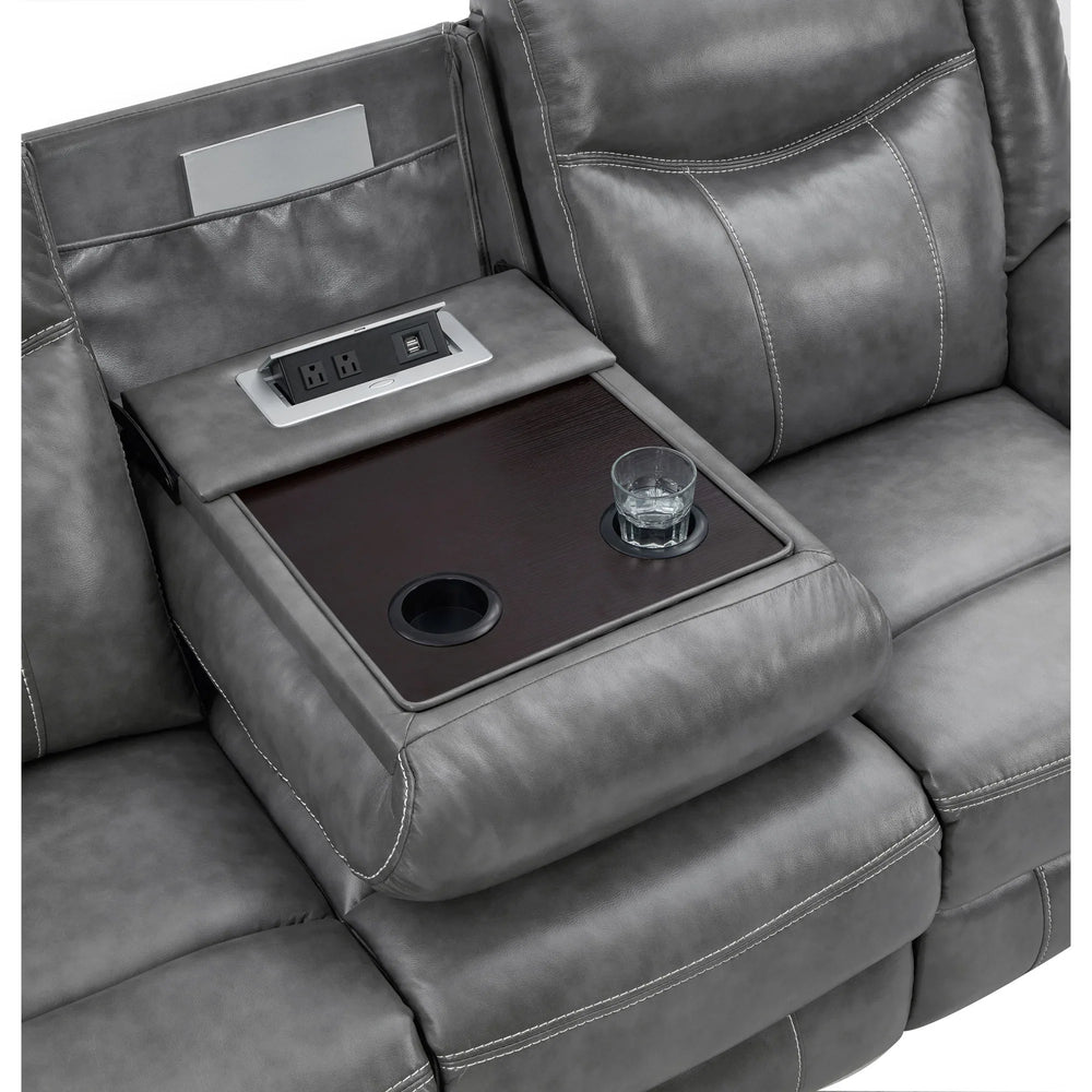 - Loveseat Console: Soft-closing lift-top storage with built-in power outlets, removable stainless-steel cup holders, and extra drawer