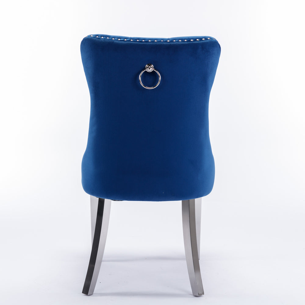 Enhance your dining space with this luxurious set of two contemporary dining chairs featuring plush blue velvet upholstery and a stylish tufted design. The foam-filled seats provide exceptional comfort for long meals and gatherings, while the solid wood frame ensures lasting durability. Chrome stainless steel plated legs complement the vibrant blue velvet with a sleek, modern touch, accented by classic nailhead trim for added sophistication. Measuring 24.6 inches long, 19.7 inches wide, and 37.5 inches high, each chair balances bold design with everyday usability. Ideal for both casual and formal dining rooms, these chairs offer lasting style and comfort to elevate your home’s aesthetic. Elevate your dining experience today with these statement chairs.