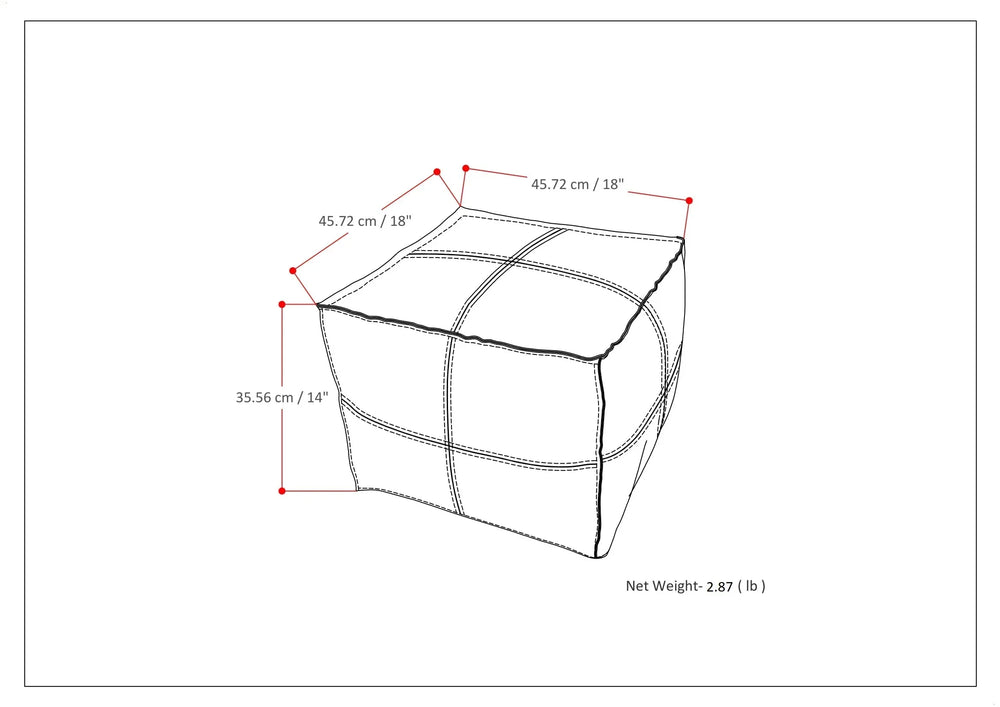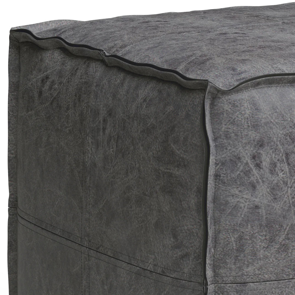 Enhance your home with the Brody Square Pouf, featuring a stylish distressed black vegan faux leather cover that adds a modern edge to any room. This versatile pouf serves as a comfortable footstool, extra seating, or a chic accent piece in your living room, family room, or bedroom. Filled with dense polystyrene beads, it maintains its supportive structure while offering plush comfort. The durable cotton bottom with a convenient zipper ensures long-lasting use, while the handcrafted details and top stitching provide a refined yet relaxed look. Compact yet functional, it measures 18 inches square by 14 inches high, making it easy to move and incorporate into your décor. Fully assembled for immediate use, the Brody pouf blends style and practicality to elevate your relaxation and living experience. Add this multi-functional piece to your home today.