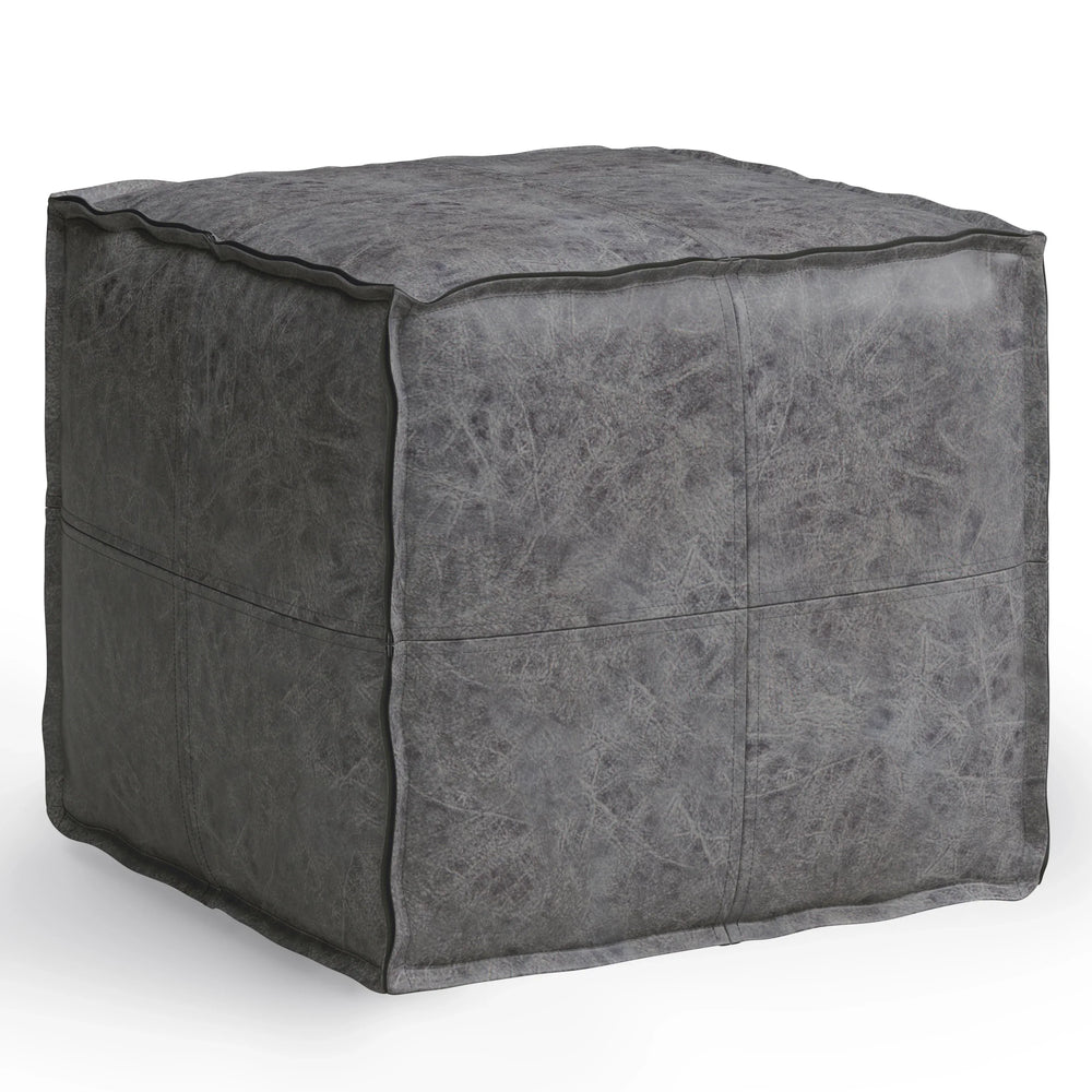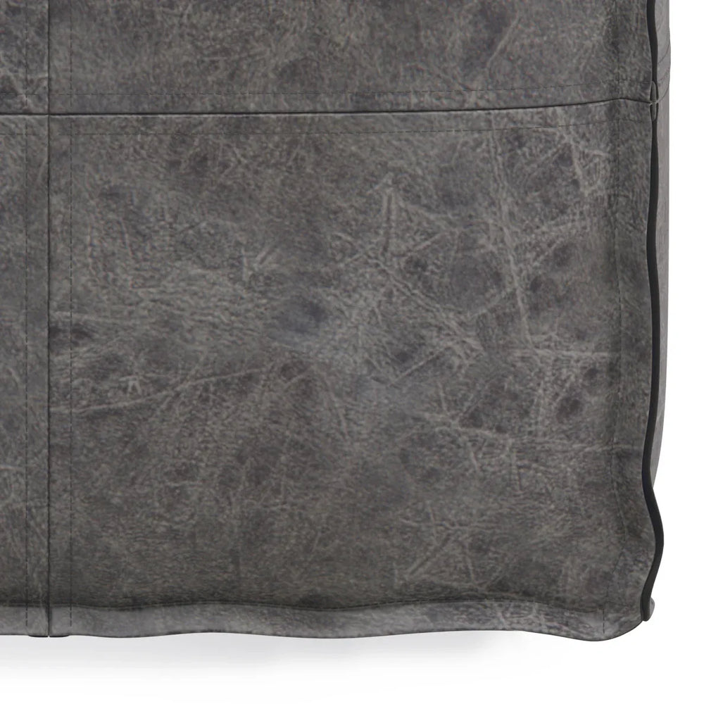 Versatile square pouf handcrafted with distressed black vegan faux leather and dense polystyrene bead filling for supportive comfort. Perfect as a footstool, accent seat, or extra living room seating, measuring 18 x 18 x 14 inches and fully assembled for easy use.