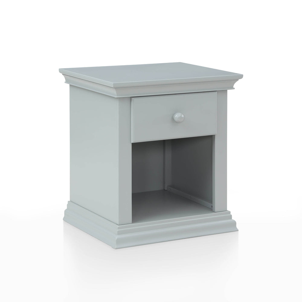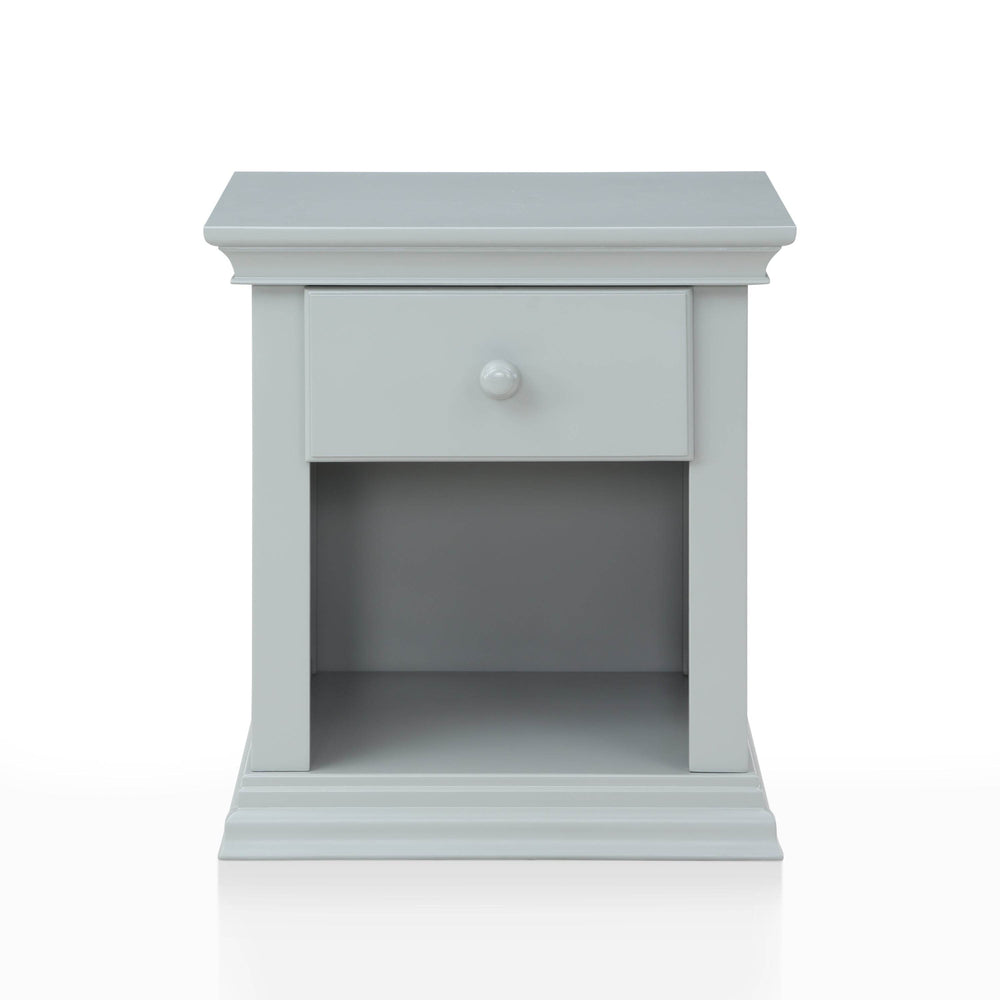 Universal Gray nightstand crafted from solid wood features traditional moldings, a single drawer for valuables, and a spacious bottom shelf for storage. Its side metal ball bearing glides and non-toxic, multi-step finish ensure durability and classic style for any bedroom.