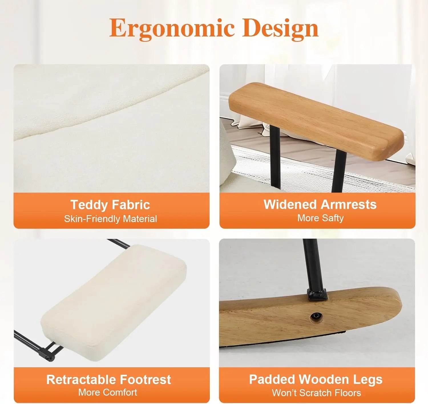 Transform your living space or nursery with this modern rocking chair designed for ultimate comfort and versatile use. Upholstered in plush teddy fabric, the chair offers a soft, inviting feel that makes it perfect for long reading sessions, nursing, or simply unwinding. Its uniquely adjustable backrest features six reclining positions, allowing you to customize your comfort from 90° to 160°. The retractable footrest provides full leg support for enhanced relaxation, turning any room into a restful retreat. Built with a sturdy steel frame complemented by solid wood armrests and legs, this glider rocker combines durability and elegance while supporting up to 250 pounds. Its sleek design and neutral beige tone integrate seamlessly with a variety of décor styles. Whether placed in a bedroom, living room, or nursery, it offers both functional comfort and modern charm. Upgrade your space today with this versatile accent chair that promotes relaxation and style.