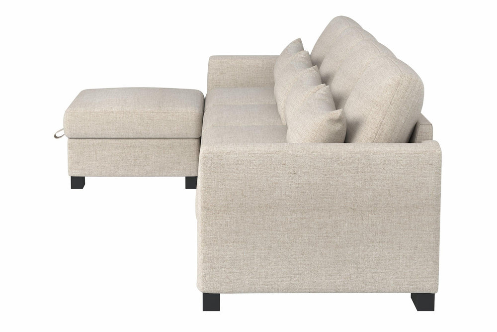 Beige modular L-shaped sofa features flexible layouts with a storage ottoman, spring pack cushions for balanced comfort and lumbar support, and a sturdy solid wood frame, ideal for primary living spaces seeking versatile, modern seating for up to five people.