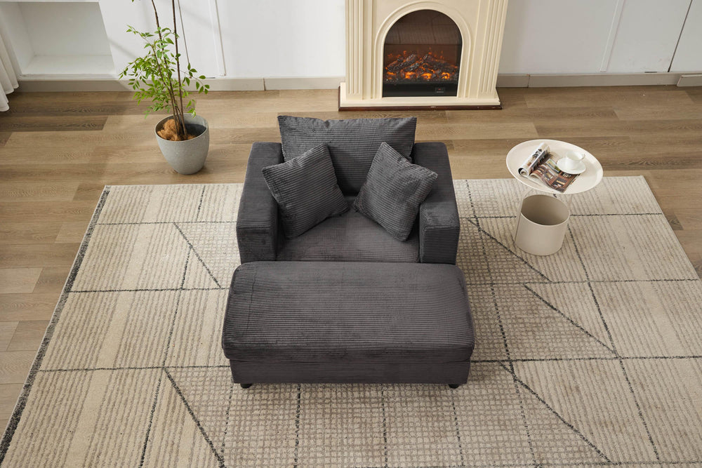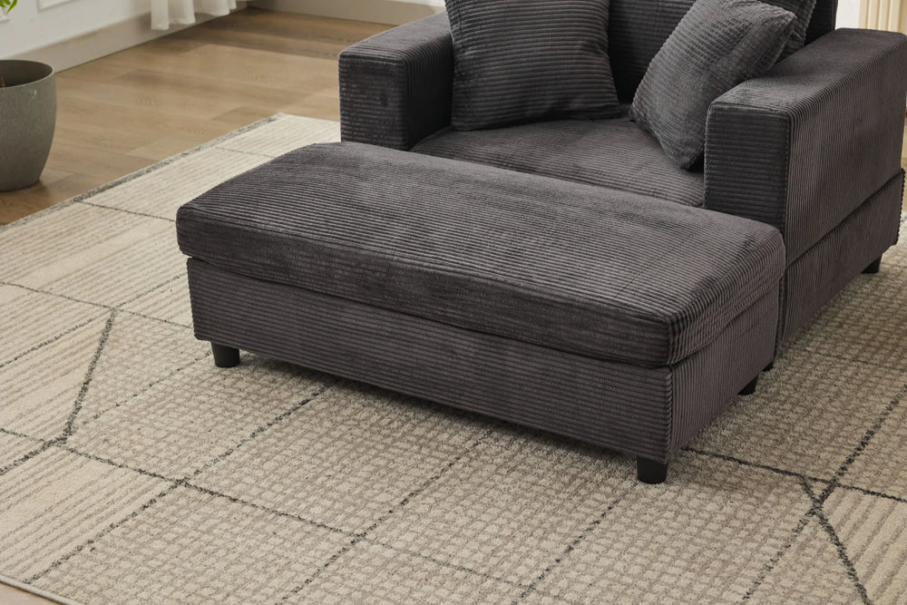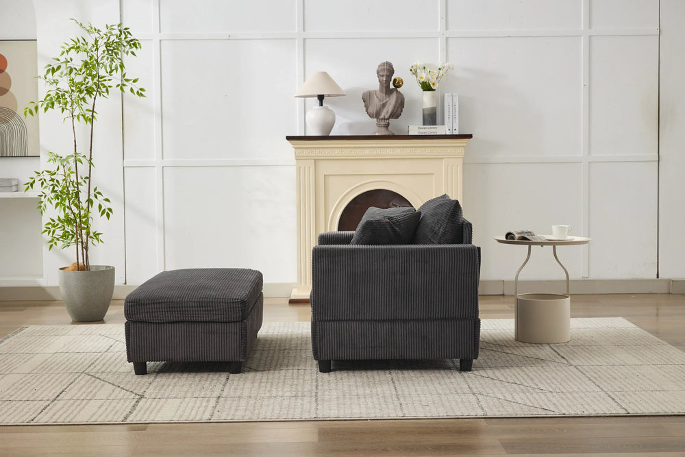 Enhance your living space with this versatile chaise lounge chair, thoughtfully designed for ultimate comfort and style. Upholstered in soft, skin-friendly dark gray corduroy, it provides a cozy seat with breathable texture and durability, perfect for everyday use. The removable ottoman lets you stretch out and relieve leg pressure or provides extra seating or table space, adapting effortlessly to your needs. Supported by a sturdy wooden frame and padded with high-resilience sponge, this chair offers firm yet plush support. Its generous dimensions invite you to relax in any position, while included lumbar pillows offer added lower back comfort. Ideal as a lounge chair, reading nook, or occasional sleeper, its modern design fits seamlessly in living rooms, bedrooms, or compact apartments. Elevate your relaxation today with this multipurpose accent armchair that blends ergonomic comfort with sleek style.